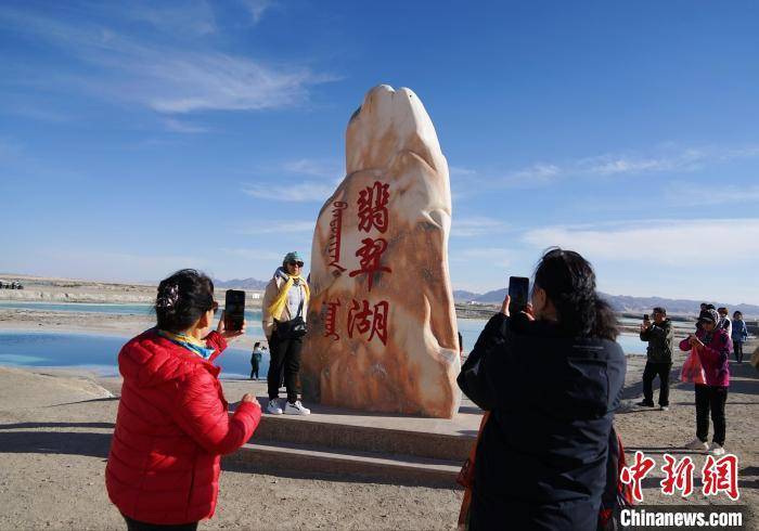 图为游客在大柴旦翡翠湖门前打卡拍照。 马铭言 摄