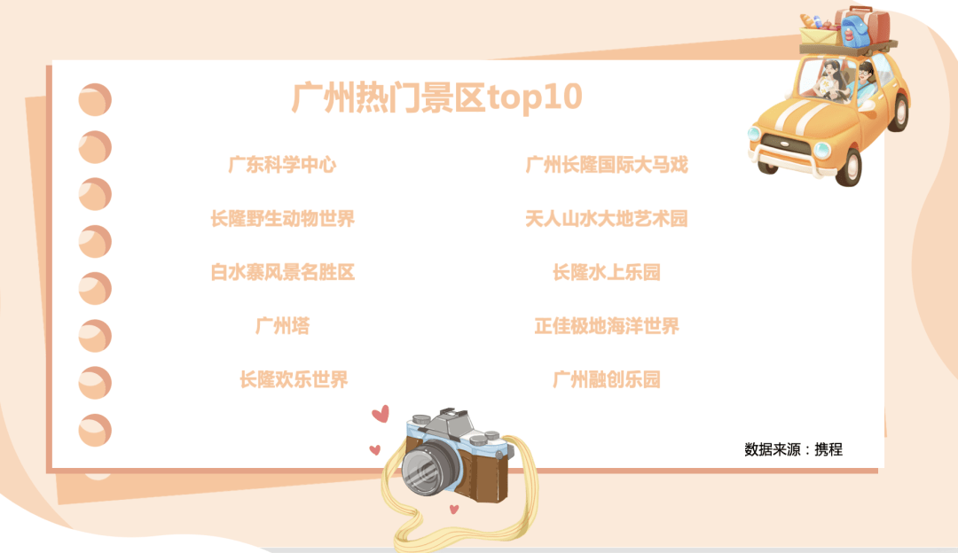景区方面,广东的十大热门景区为广东科学中心、世界之窗、长隆野生动物世界、珠海长隆海洋王国、星湖旅游景区、丹霞山、星湖湿地公园、白水寨风景名胜区、东部华侨城、广州塔;广州热门景区top10则分别是广东科学中心、长隆野生动物世界、白水寨风景名胜区、广州塔、长隆欢乐世界、广州长隆国际大马戏、天人山水大地艺术园、长隆水上乐园、正佳极地海洋世界、广州融创乐园。