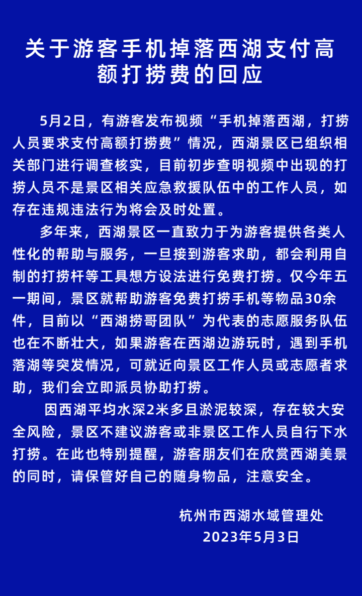 5月3日,杭州市西湖水域管理处发布《关于游客手机掉落西湖支付高额打捞费的回应》,原文如下: