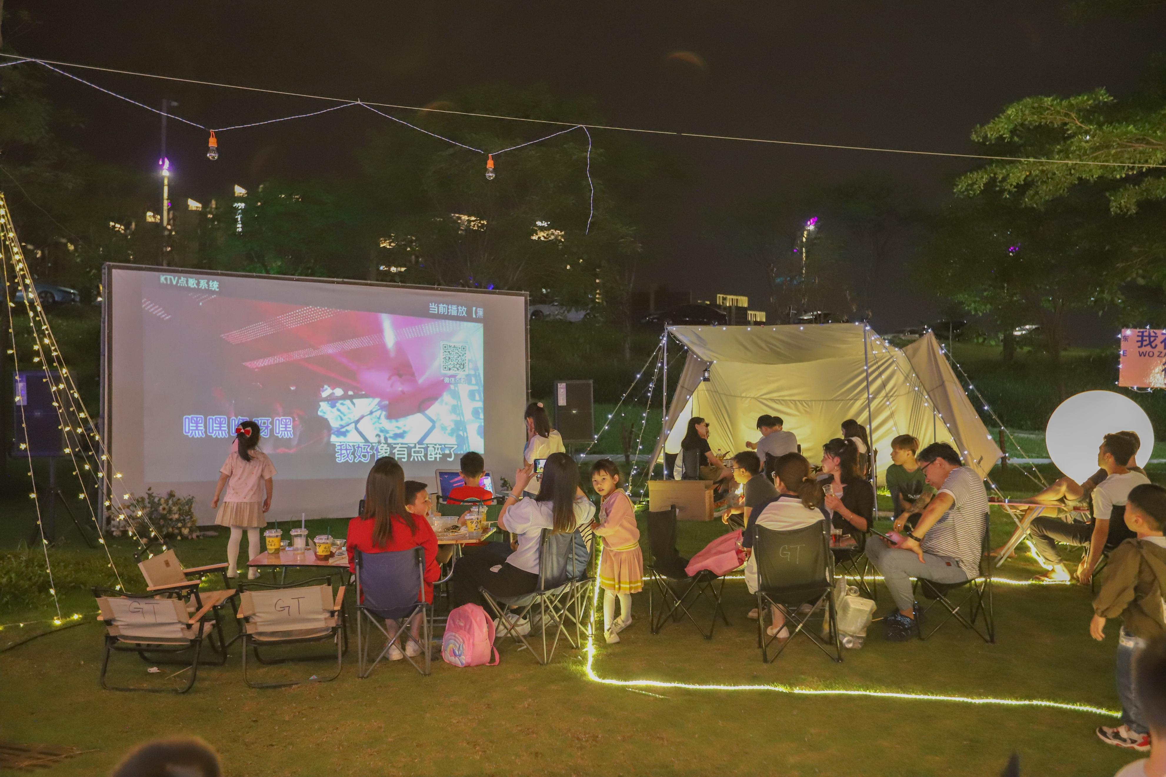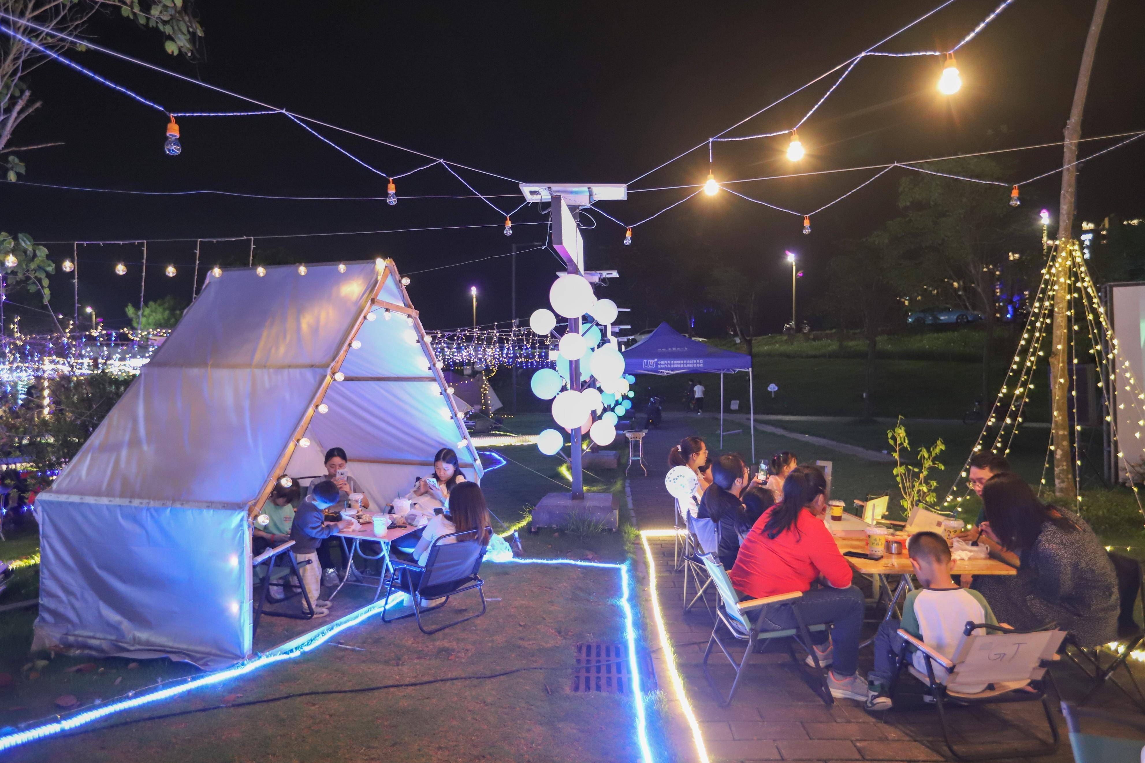 美食街是沿着河堤而开设的露天大排档,但带有网红属性,因为大排档已经加入了许多的帐篷,投影银幕等;