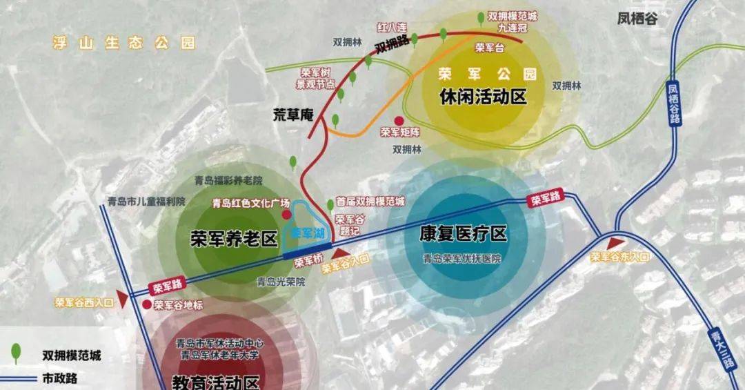青岛“荣军谷”是浮山生态公园的重要组成部分,是为军人军属、退役军人和其他优抚对象服务的综合体,主要由教育活动区、荣军养老区、康复医疗区和休闲活动区4大区域组成,初步形成“一谷两院八中心”的布局,打造集康养、旅游、教育、休闲、健身、志愿服务、就业创业于一体的退役军人综合服务基地,是青岛“荣军文化”新地标。