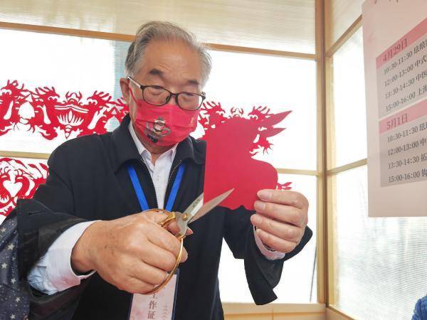 剪纸艺术区,非遗项目“上海剪纸”代表性传承人孙继海老先生为游客表演剪纸。上观新闻 图