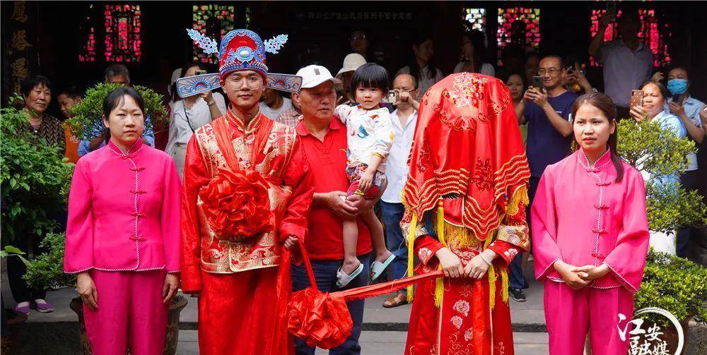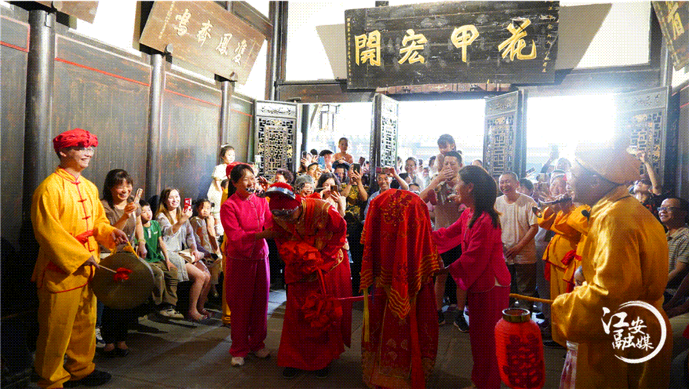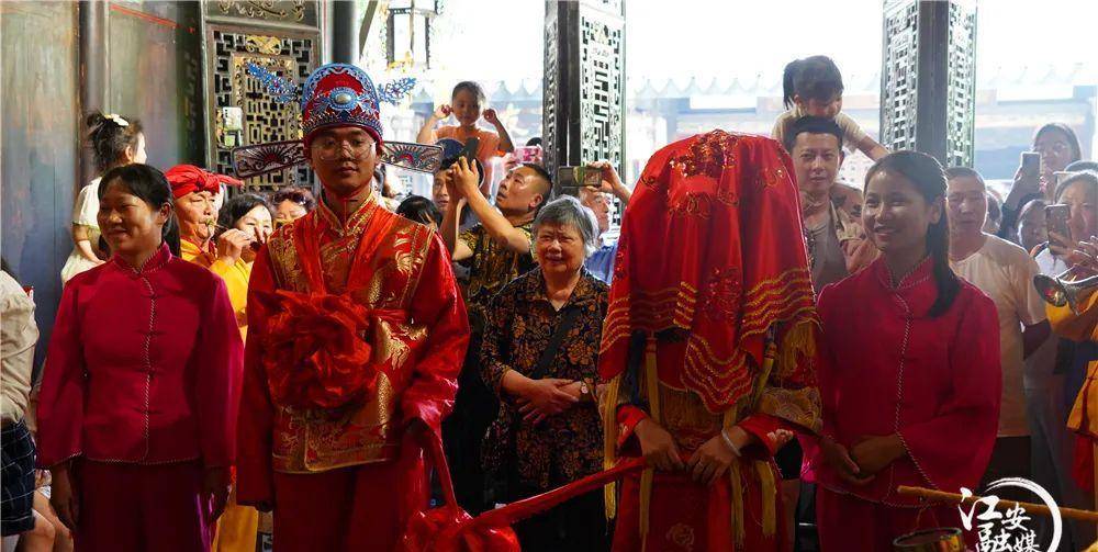 起轿、玩轿、回车马、下轿、拜堂等传统婚俗礼仪一一呈现,身穿大红喜服的新郎、头戴盖头身披霞帔的新娘在众人簇拥下拜天地、入洞房。