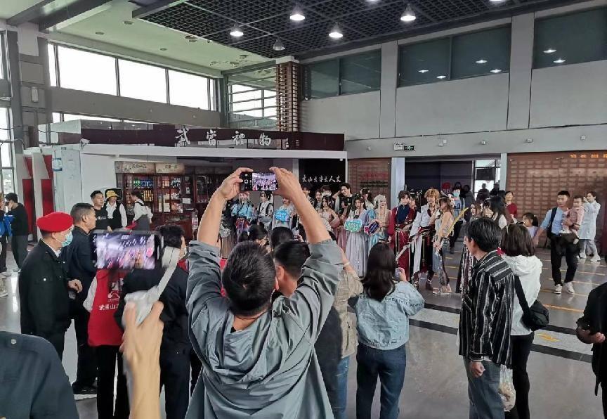 上午九点coser巡游,走进武当山景区和游客互动,拍照打卡。(武当融媒记者 汪伟)