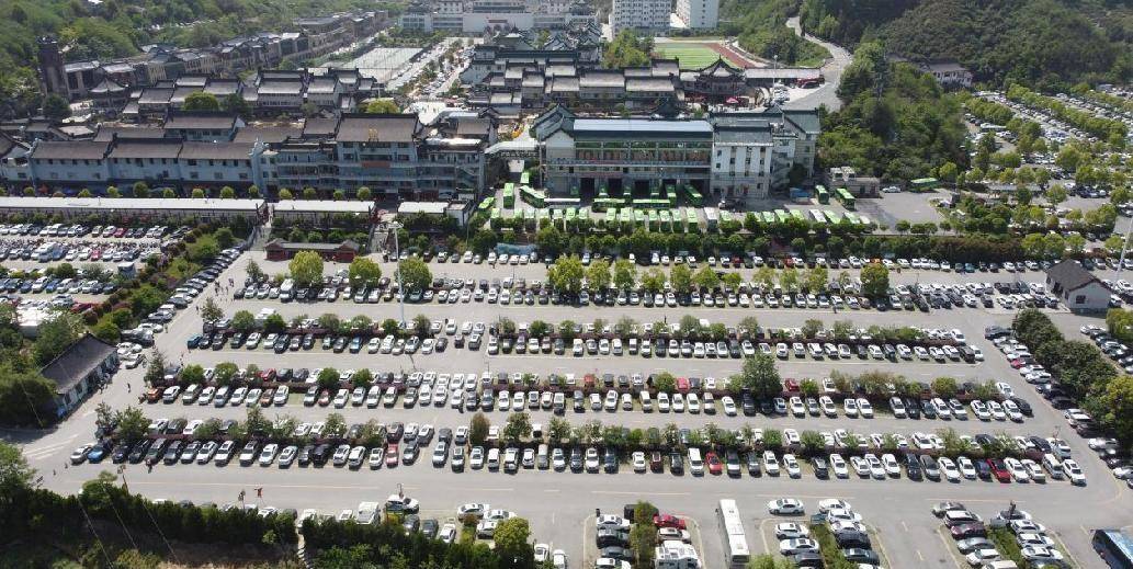 车辆有序停放,来自河南、襄阳、西安、武汉等地的游客有序进入武当山景区。(武当融媒记者 周容翼 通讯员 周岩)