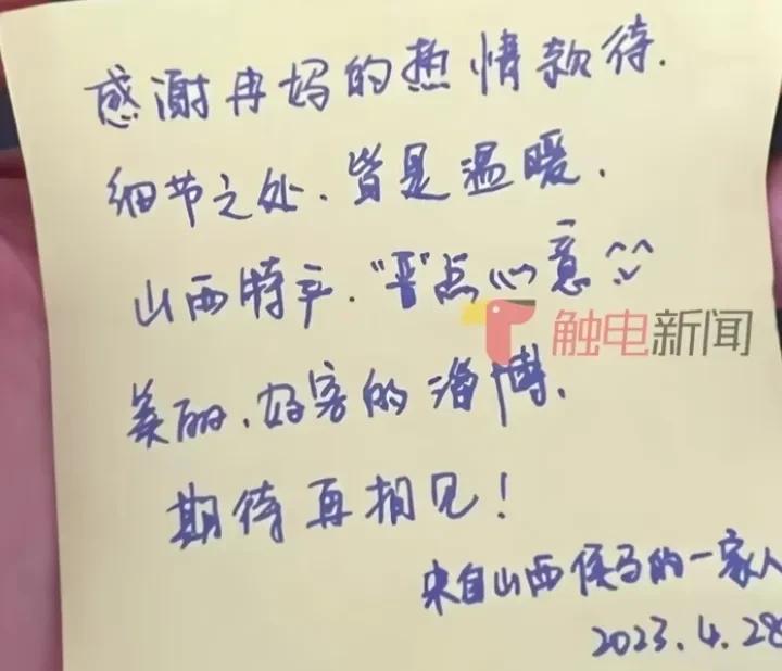 临走的时候,山西游客不仅打扫了卫生,还放了一整箱山西的特产和留言条表示感谢。
