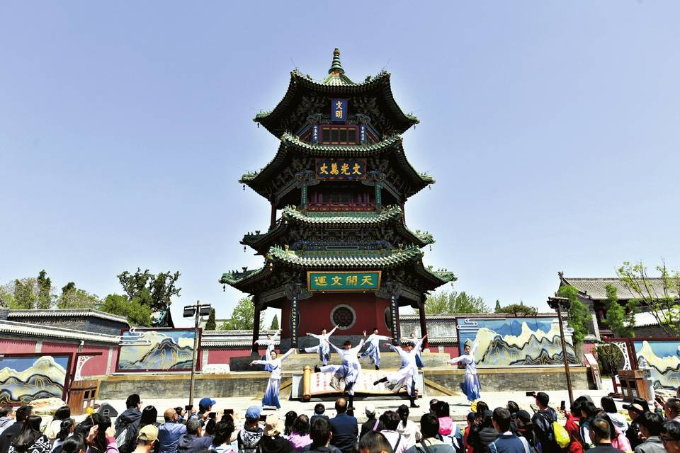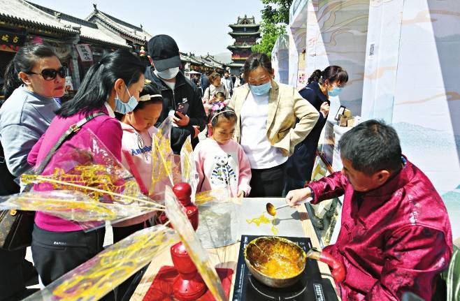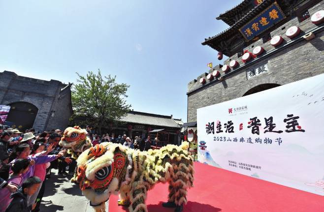 4月29日至5月3日,由山西省文化和旅游厅、山西晚报社联合主办的“潮生活晋是宝”2023山西非遗购物节在太原古县城开启全省范围内第一阶段的联动展销活动。活动将非遗展销、体验融入民众生活场景,将假日人流有效转化为非遗客流,收获可观销量的同时赢得更大声量。大图为游人围观太原古县城的民俗表演。小图上为非遗购物节现场的舞狮表演,小图下为非遗集市上的糖画。