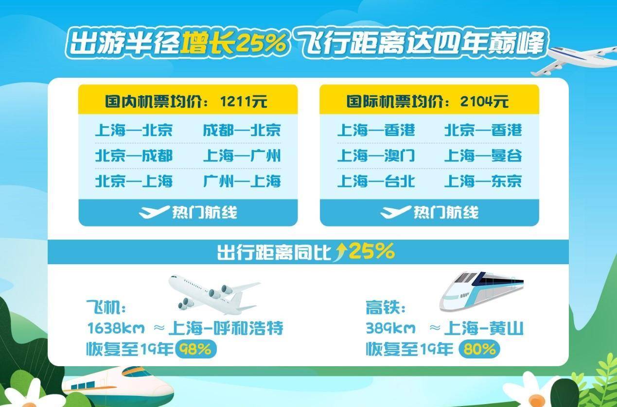 报告显示,“五一”期间用户平均出游半径较去年同期增长25%,其中飞机出行平均距离为1638km,约等于上海飞往呼和浩特的距离,达到4年来巅峰,基本恢复至2019年同期水平。“高铁游”出行距离同样大幅提升,用户单程平均出行389km,恢复至2019年八成水平,约等于上海至黄山的单程距离。