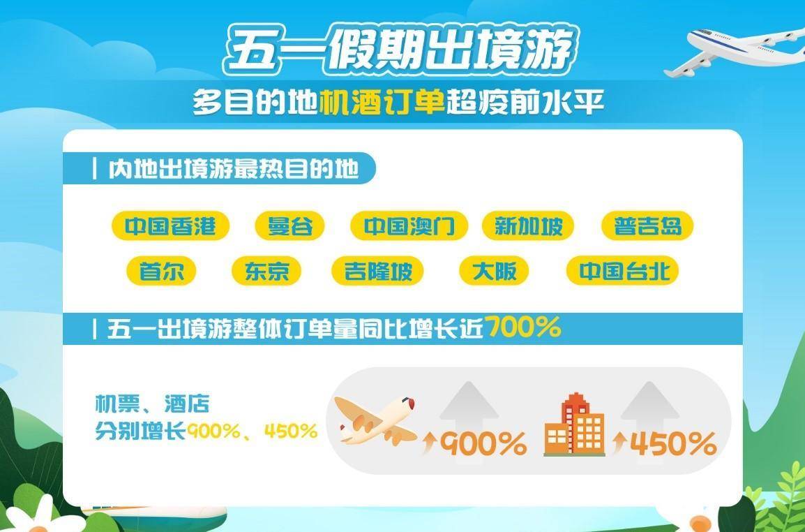 随着今年以来出入境政策陆续放宽,“五一”假期成为近三年来出境游规模最盛的假期。从整体订单量来看,“五一”内地出境游整体订单量较去年同期增长近700%,出境机票、酒店订单量分别较2022年同期增长近900%、近450%。