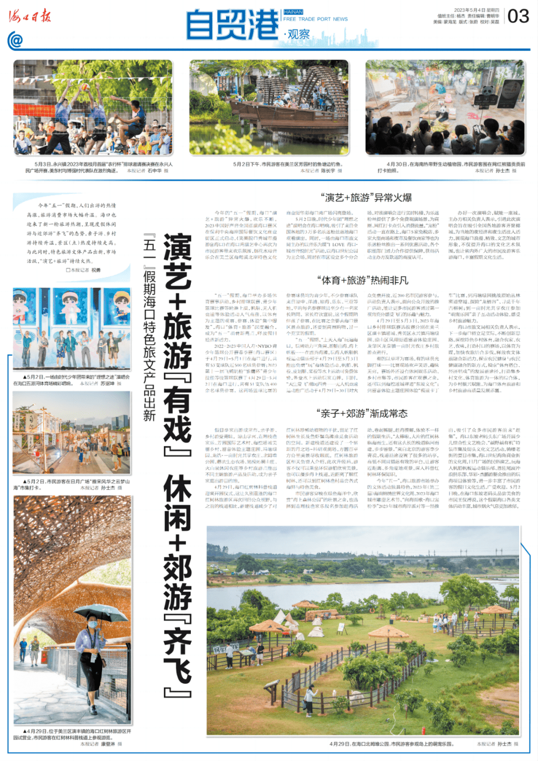 今年“五一”假期,人们出游的热情高涨,旅游消费市场大幅升温。海口也迎来了新一轮旅游热潮,呈现度假休闲游与近郊游“齐飞”的态势,亲子游、乡村游持续升温,景区(点)热度持续走高。与此同时,特色旅游文体产品出新,市场活跃,“演艺+旅游”持续火热。