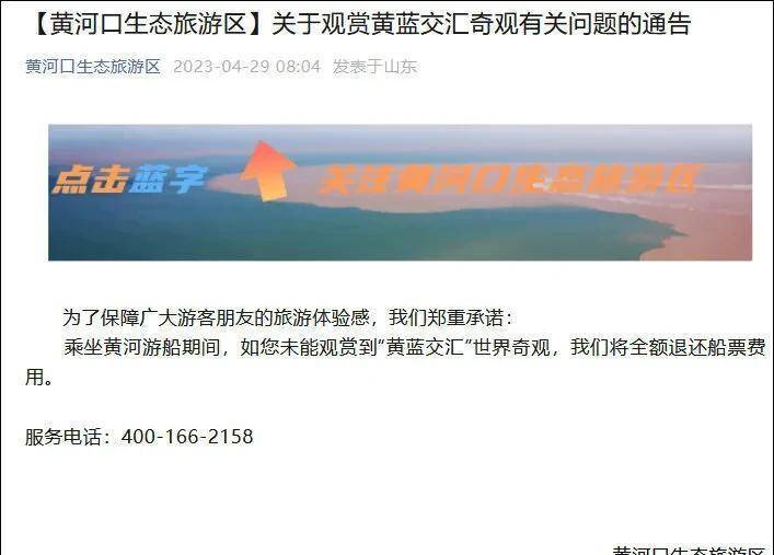 通告称,为了保障广大游客朋友的旅游体验感,景区郑重承诺:“乘坐黄河游船期间,如您未能观赏到’黄蓝交汇’世界奇观,我们将全额退还船票费用。”