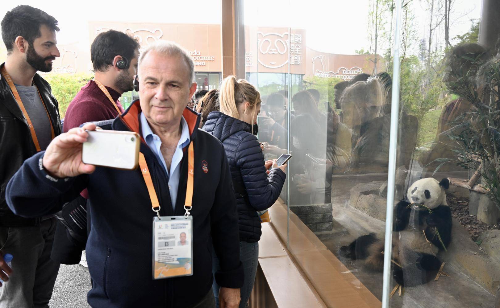 熊猫基地作为成都市的名片之一,早已吸引了前来参加“春节”的宾客。一进大熊猫营地,他们就把手机和相机从看到第一只大熊猫起就一直开着。无论是FISU联合会代理主席雷诺·艾德、秘书长艾瑞克·森超,还是副团长,以及各参赛代表团的官员,都在当下成为了“旋转”粉丝。基地里的大熊猫,无论是缓缓行走、咀嚼竹子,还是夜晚吊在树上,都能唤起它们的快乐。
