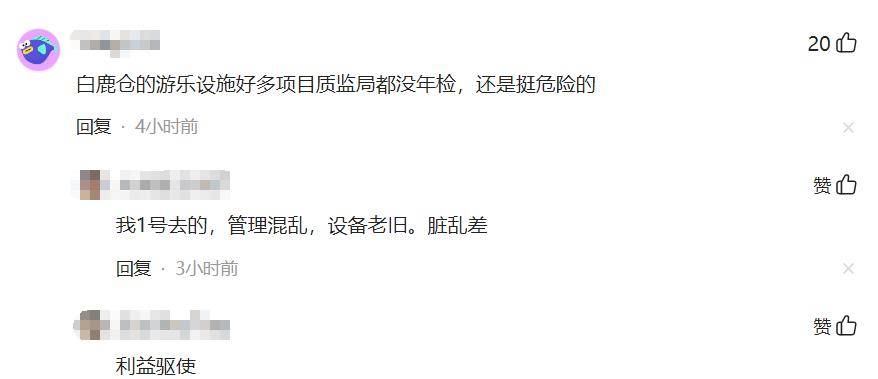 一位网友爆料,白鹿仓的游客设施有很多项目,质监局都没有年检,挺危险的。