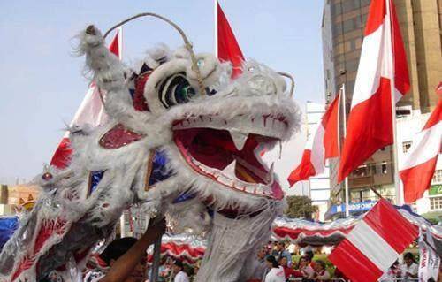 在2006年秘鲁国庆日大庆祝中,走在花车队伍最前列的中国特色的舞龙队。而这支舞龙队就是华人组织的。