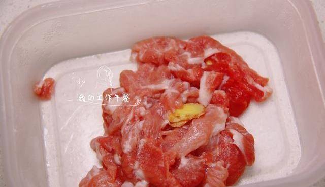 第三步:瘦肉切薄片,放盐、姜片腌制5分钟,备用。