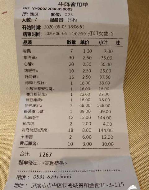 问大家为什么舍近求远,不在济南吃烧烤?这张消费单回答了所有疑问。