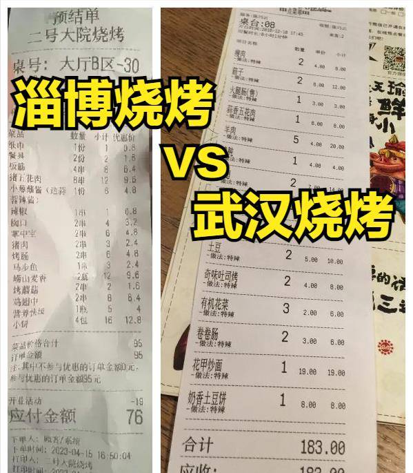 武汉网友也不甘示弱,贴出消费单对比,表示自己2个人晚饭后再吃烧烤,没点什么东西就花了183,而点单分量更多的淄博烧烤则只要76块,连武汉的零头都不到。
