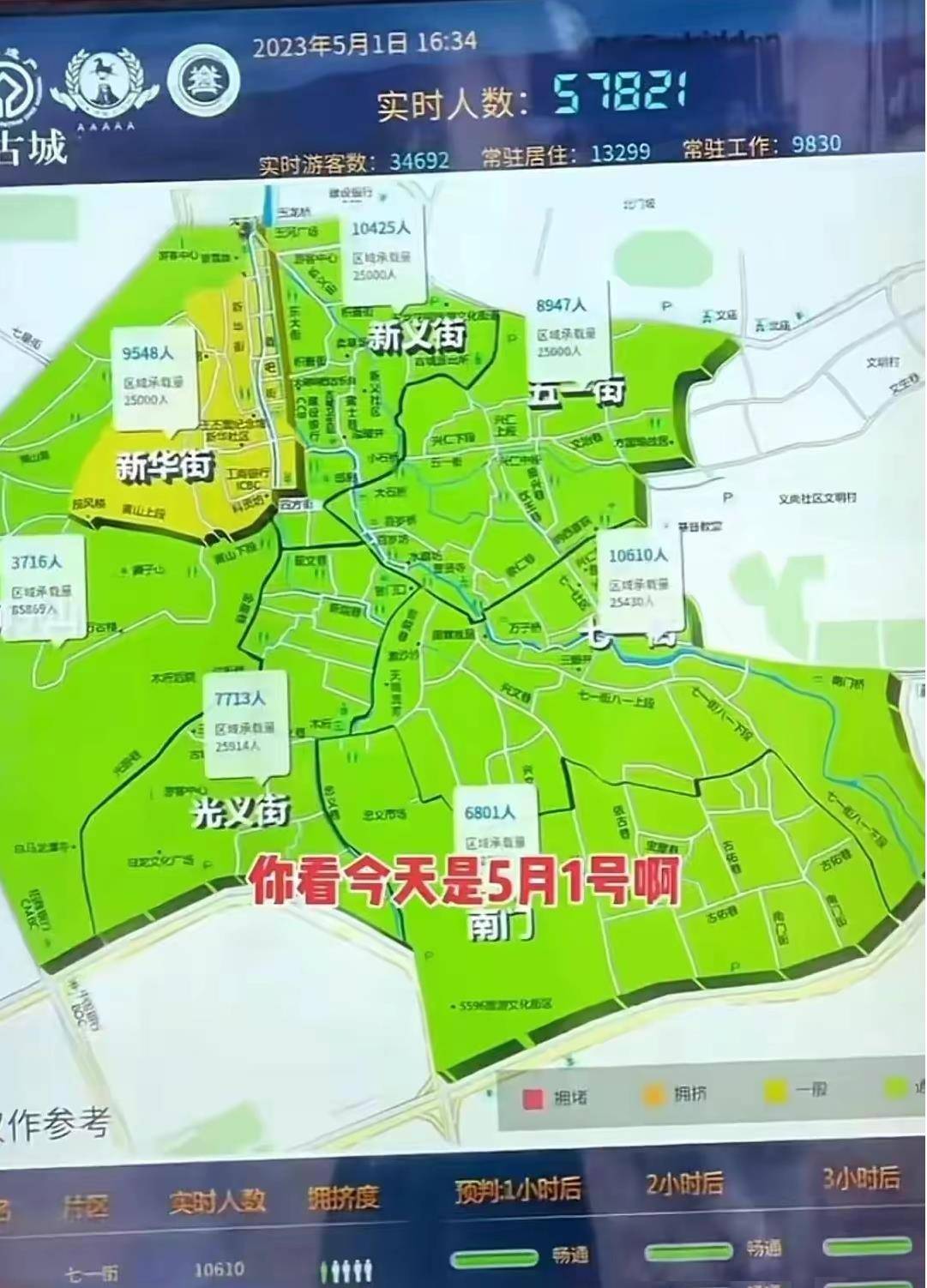 5月1日下午16:34,本应熙熙攘攘的丽江古城,全城实时游客人数只有34692人,区域承载量为2.5万人的五一街,连游客带居民和店员总共只有8947人。