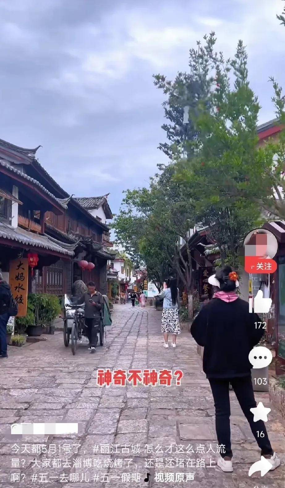 与唐山同病相怜的还有丽江。五一快过完了,期望中的人声鼎沸并没有出现,古城的街道上跟平时差不多清幽。游客们放过丽江了。