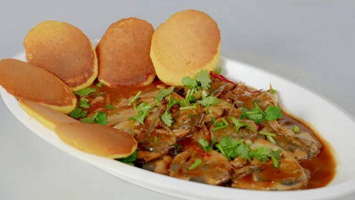 还有这道鱼锅饼子,锅底是黑鱼、小黄花鱼等小杂鱼,锅边是金黄的玉米饼子,吃起来鲜香美味。