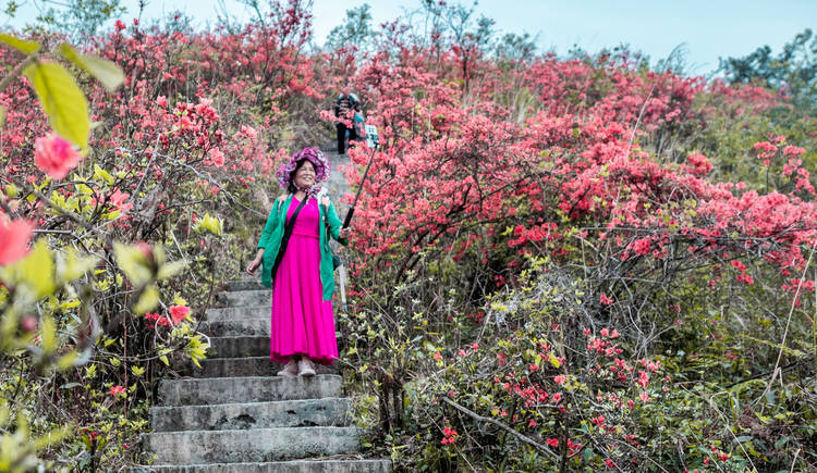 五一长假期间,湖南张家界慈利县金岩土家族乡金鸡洞村罗峰山顶上,杜鹃花开得正盛,山上游人如织,他们走在小径中,闻花香,拍花景,好不惬意。(文 张奇涛)