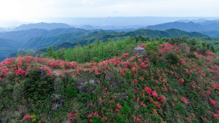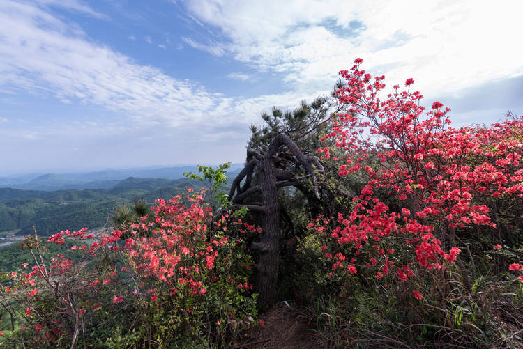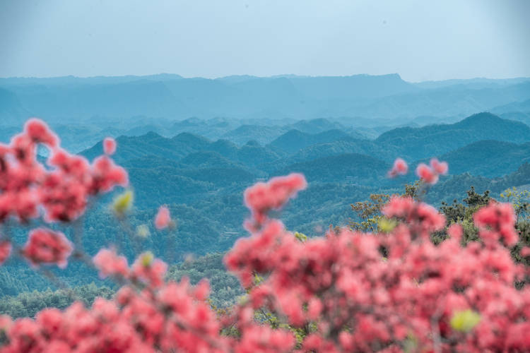 透过杜鹃花眺望远方,可以看到层叠的山峦 摄影 张奇涛
