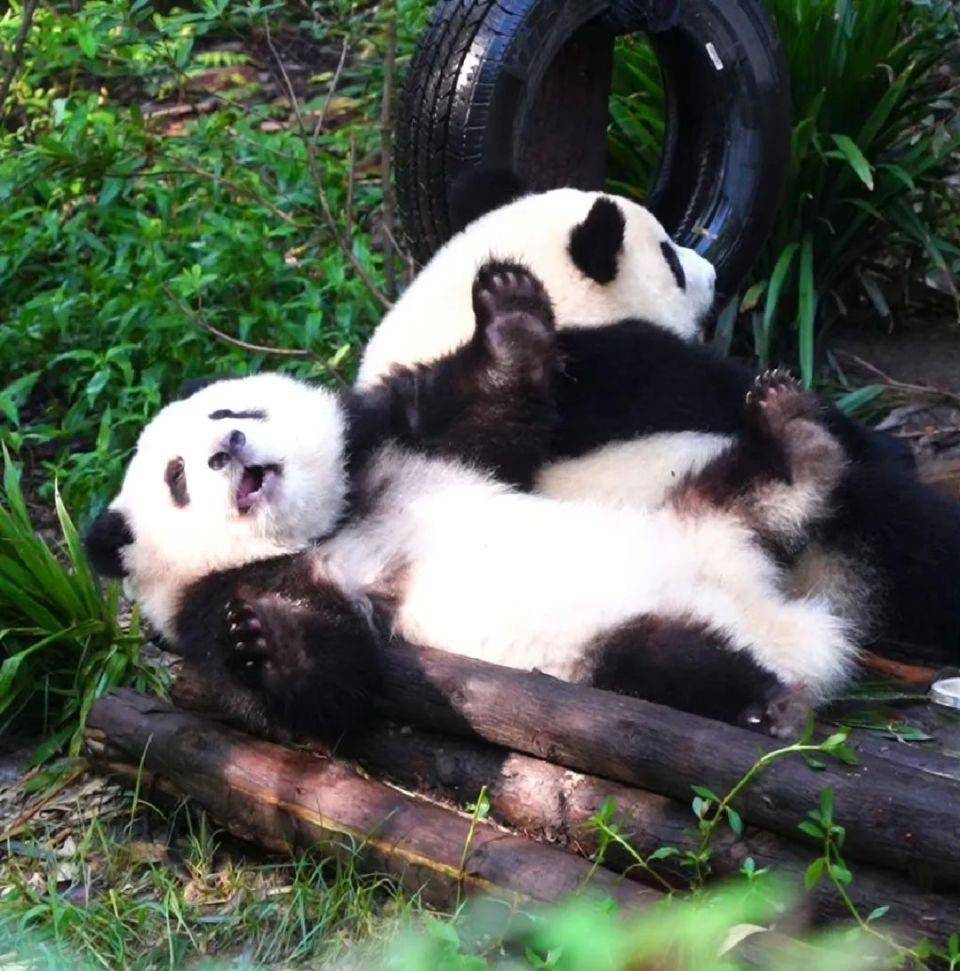 -花花不会拒绝被同龄的大熊猫当枕头。