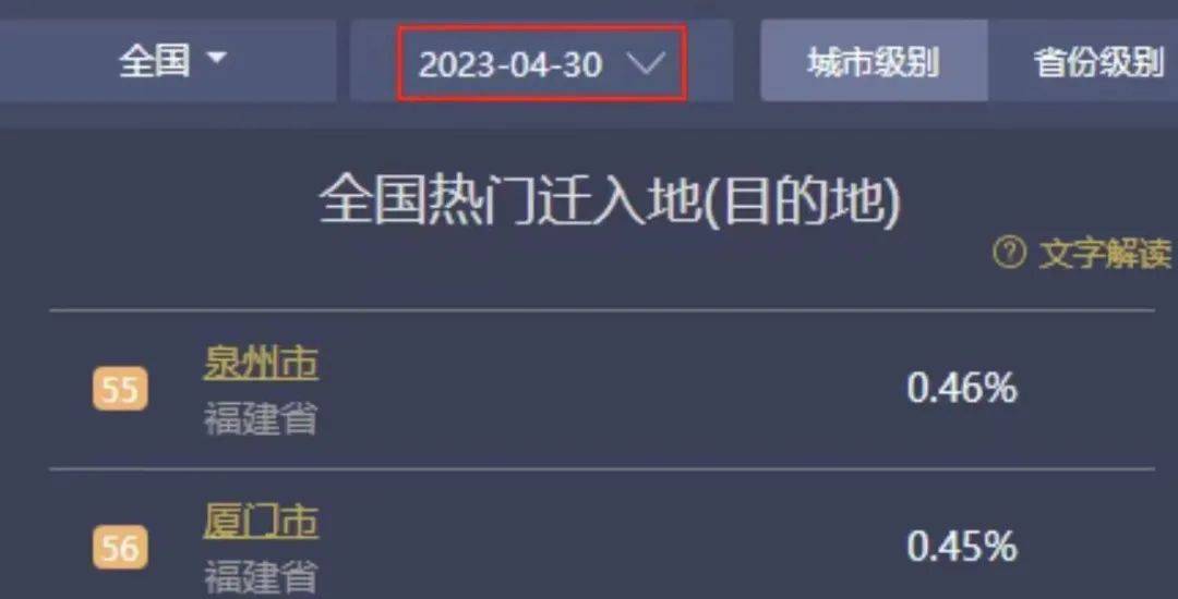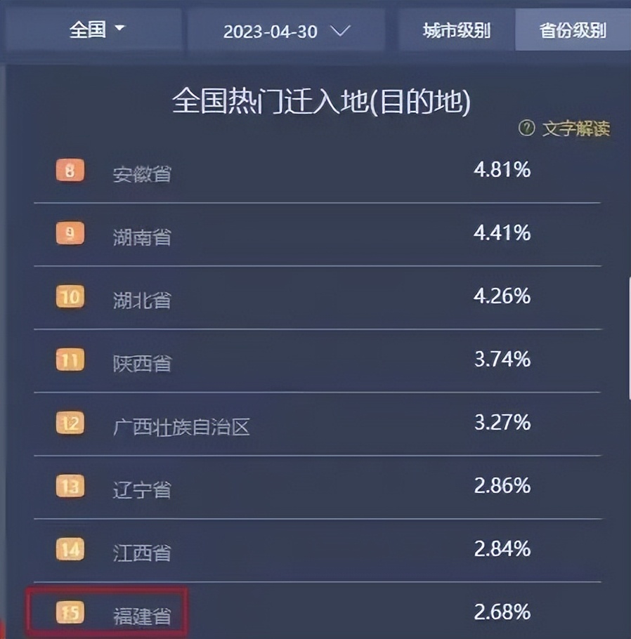携程网的统计显示,截至4月30日晚,在全国热门迁入地排名中,福建在省级迁入地中排名第15,排在福建前面的有安徽、湖南、湖北、广西、江西等省;在市级迁入地中,厦门排名第56位,甚至不如泉州,泉州排名第55位。