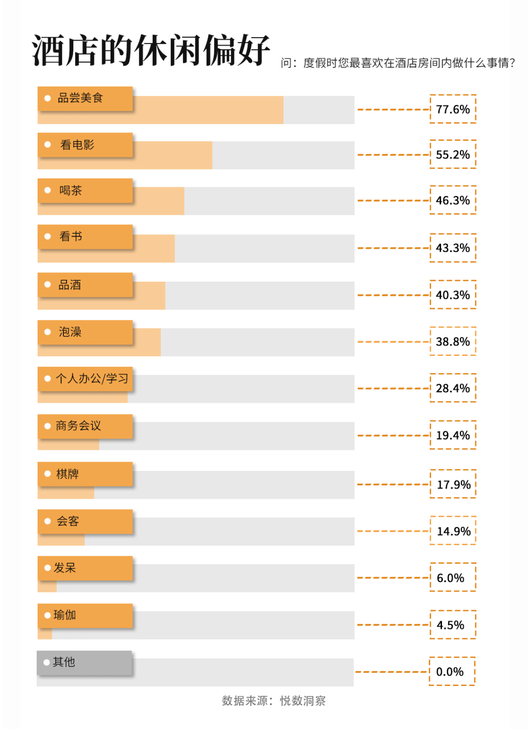 此外,也有较高比例的高净值人群喜欢品酒、喝茶等放松身心的体验,酒店经营者也需要更多着力于行政酒廊与私人茶桌的品质服务。