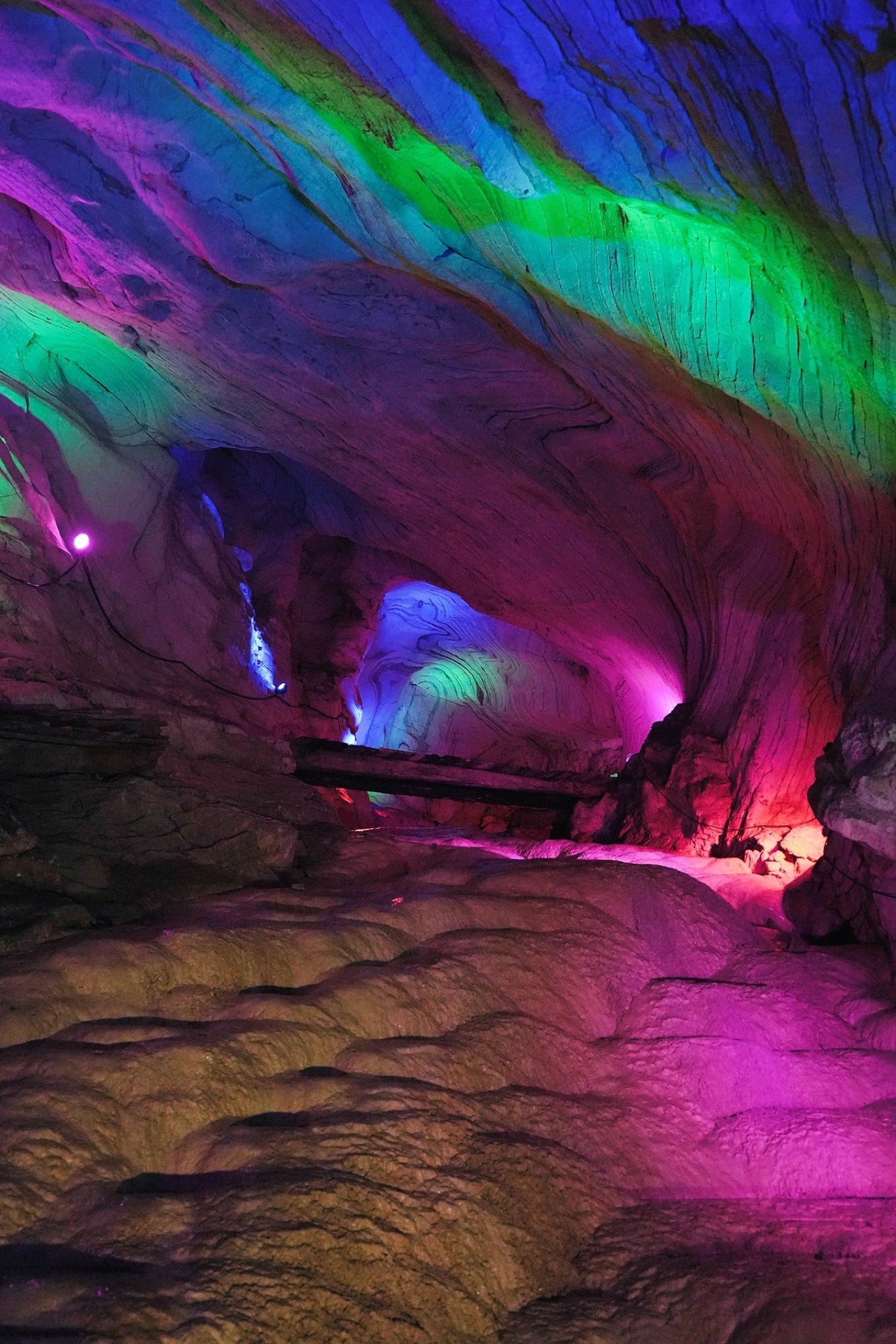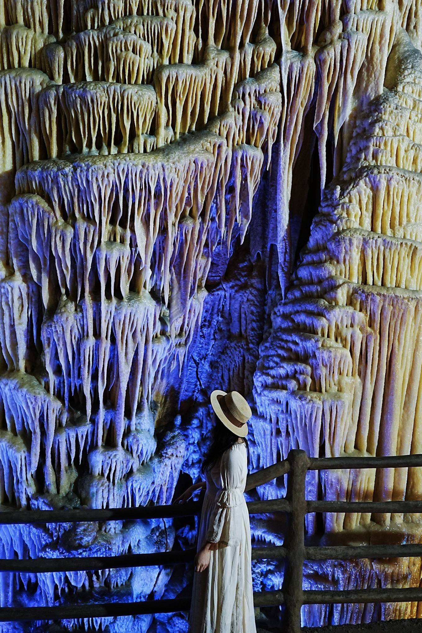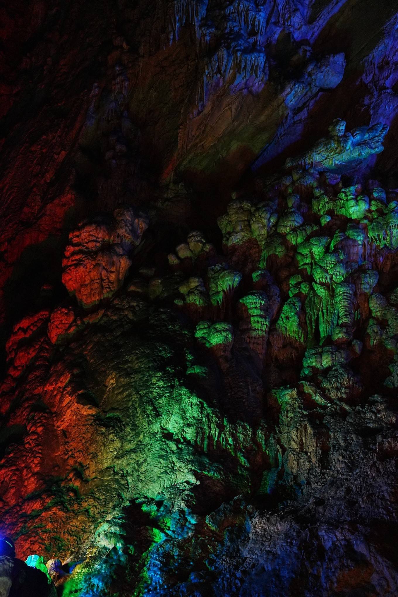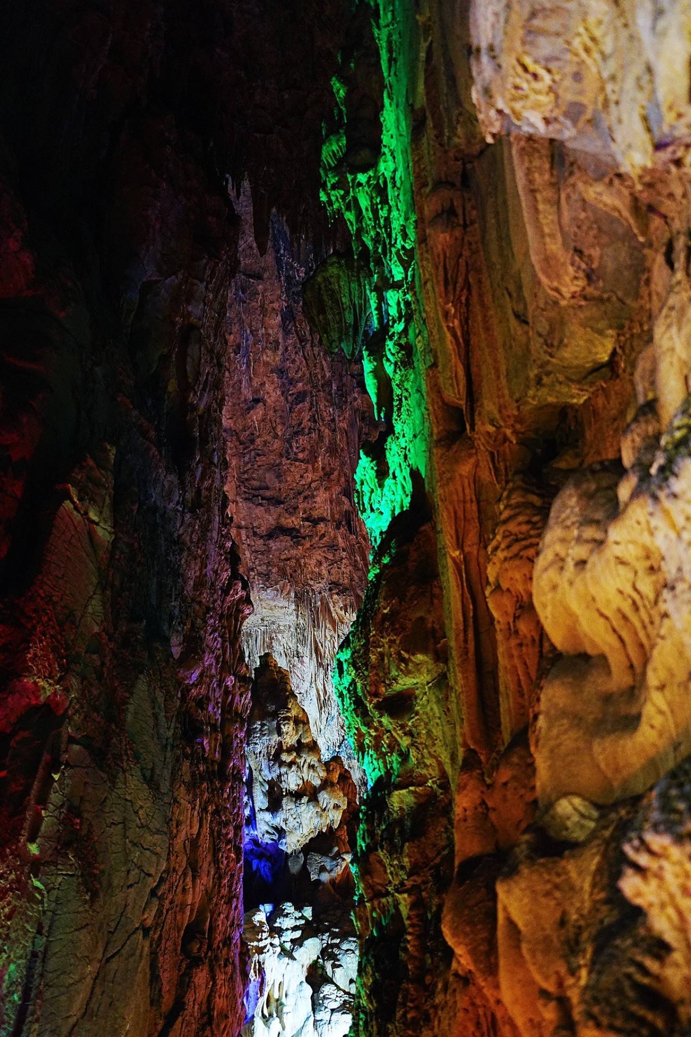 不同的色彩给洞穴增添了不同的温度,走到深处时火红的灯光让人身心舒畅,湿润冰凉的气流好似从脚底开始变得暖和起来,洞中的搭配正是人与自然最巧妙地结合,如果没能坚持走完,那真是此行最大的遗憾。越向溶洞的中心走去,钟乳石的形状也是千奇百怪, 白玉 瀑布更是令人叹为观止!
