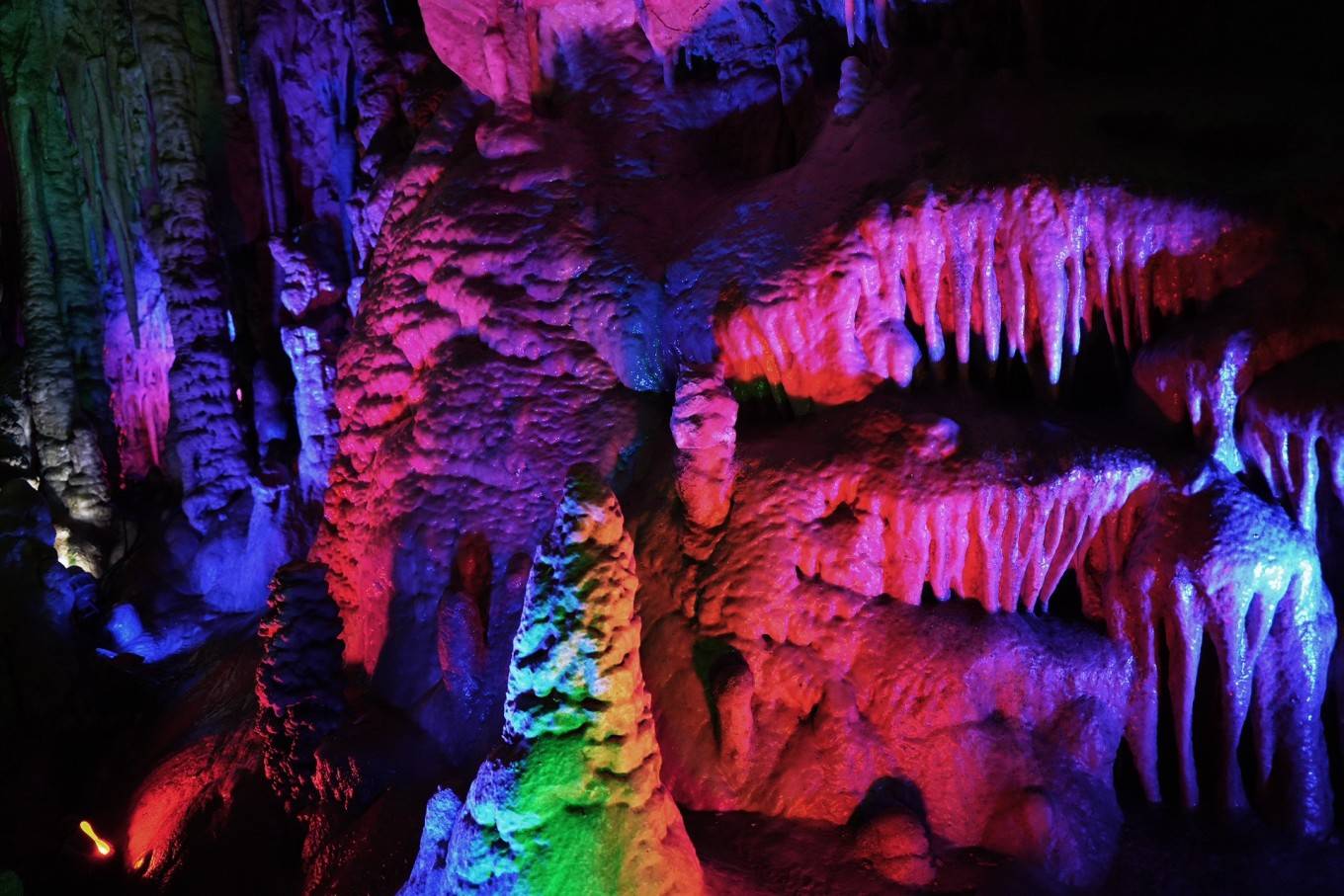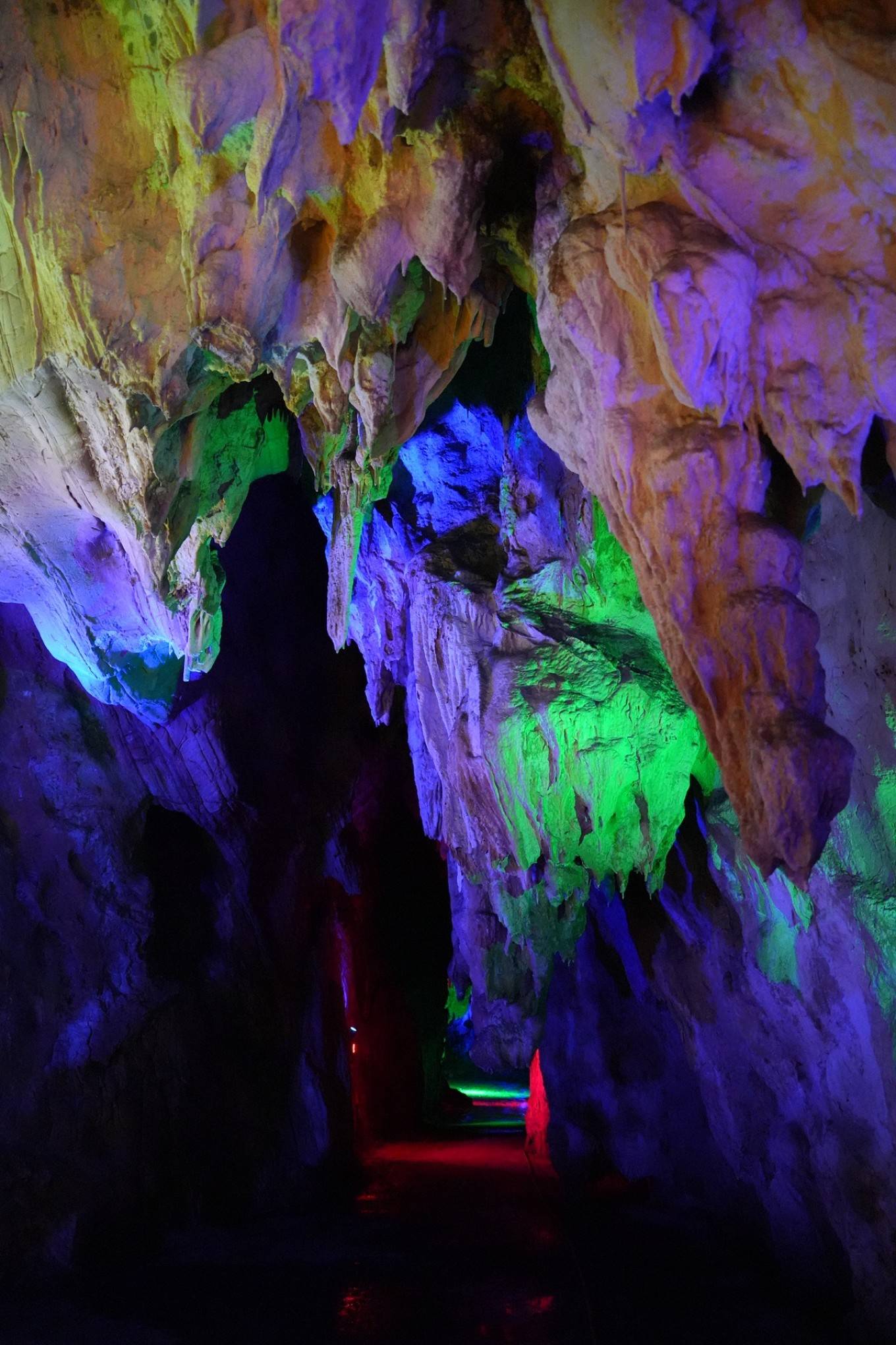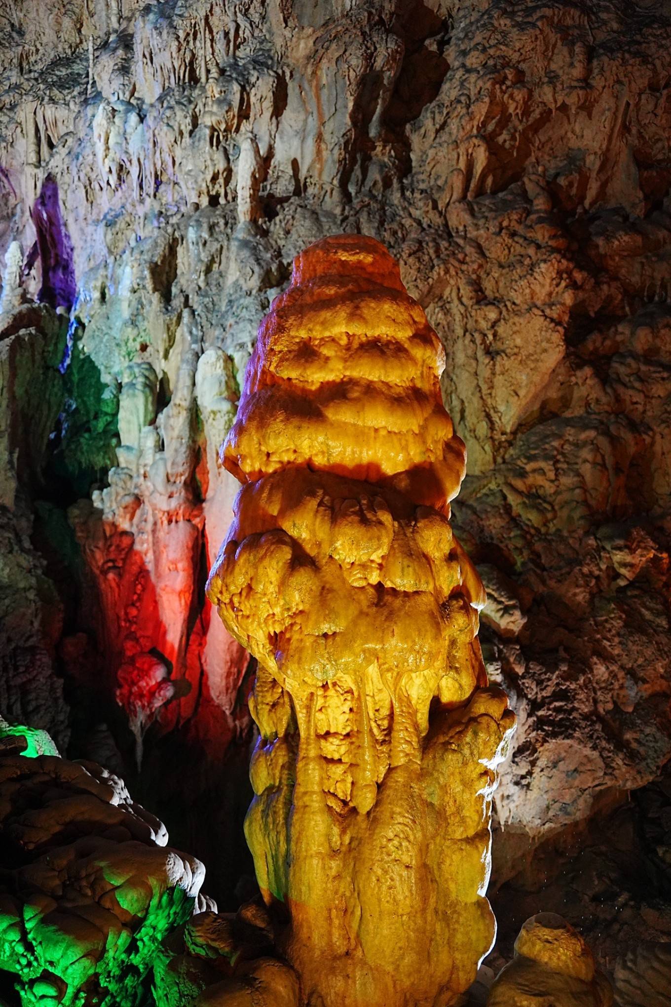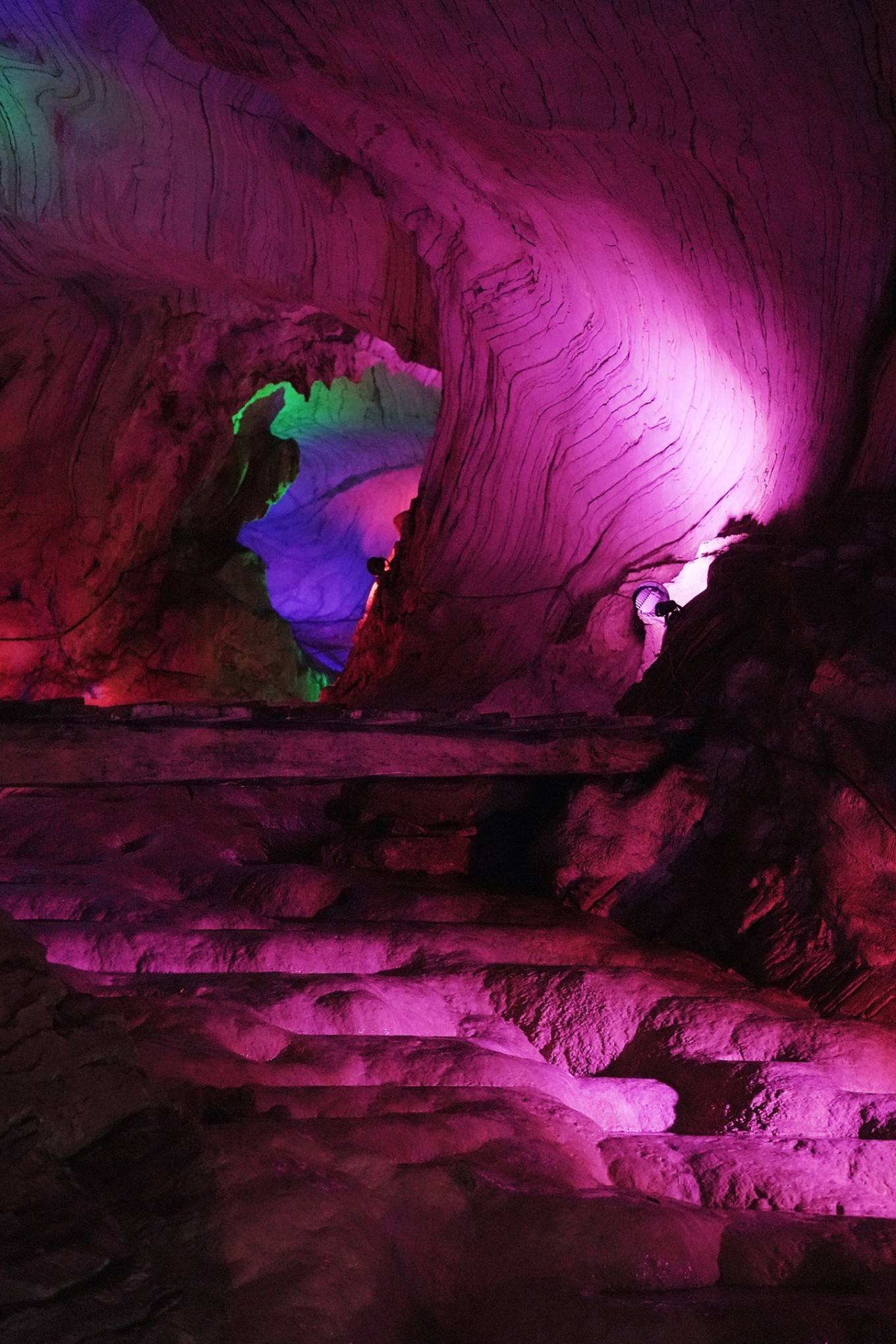 不同的色彩给洞穴增添了不同的温度,走到深处时火红的灯光让人身心舒畅,湿润冰凉的气流好似从脚底开始变得暖和起来,洞中的搭配正是人与自然最巧妙地结合,如果没能坚持走完,那真是此行最大的遗憾。越向溶洞的中心走去,钟乳石的形状也是千奇百怪, 白玉 瀑布更是令人叹为观止!