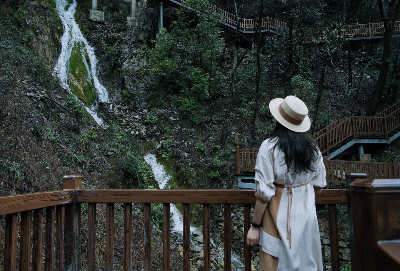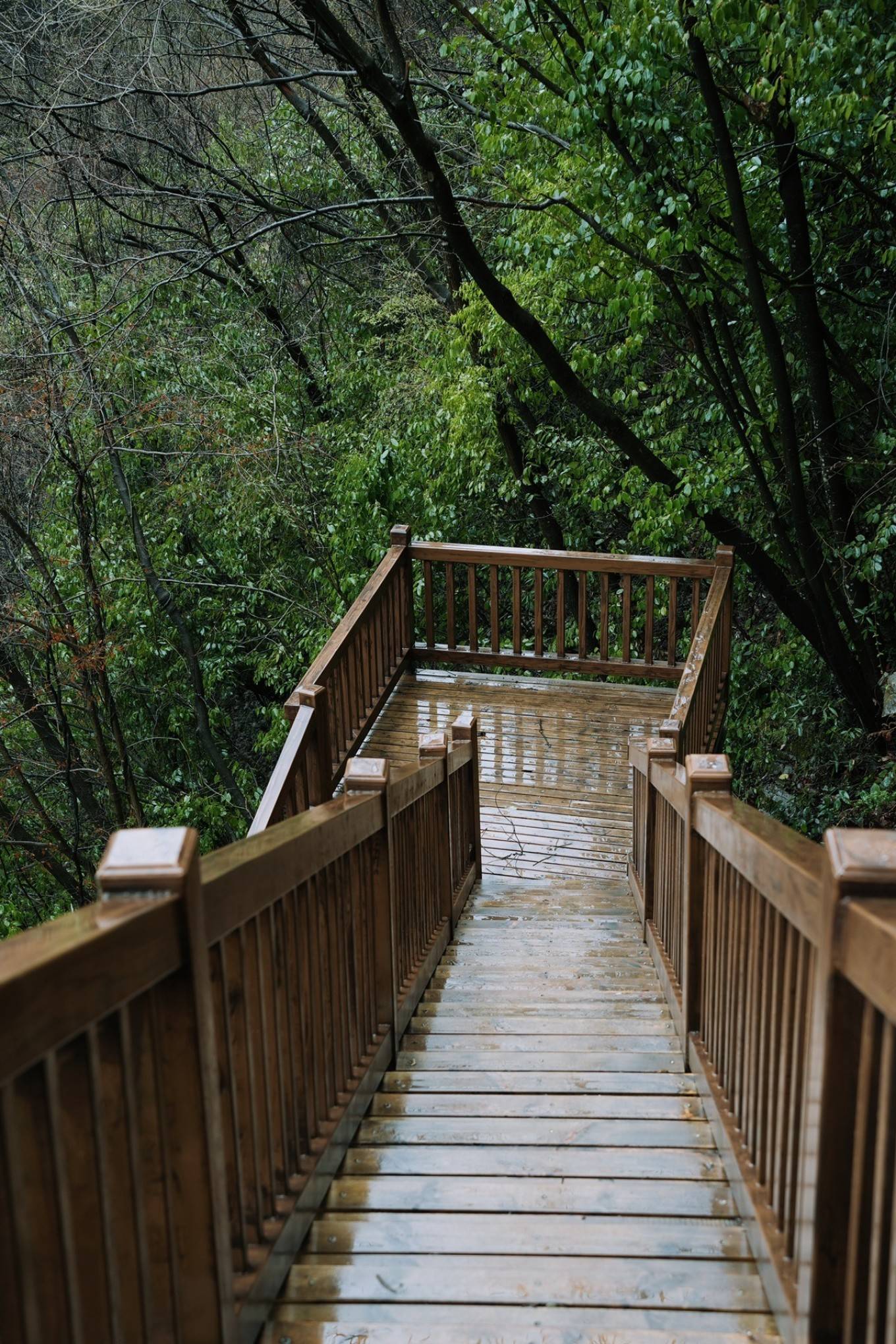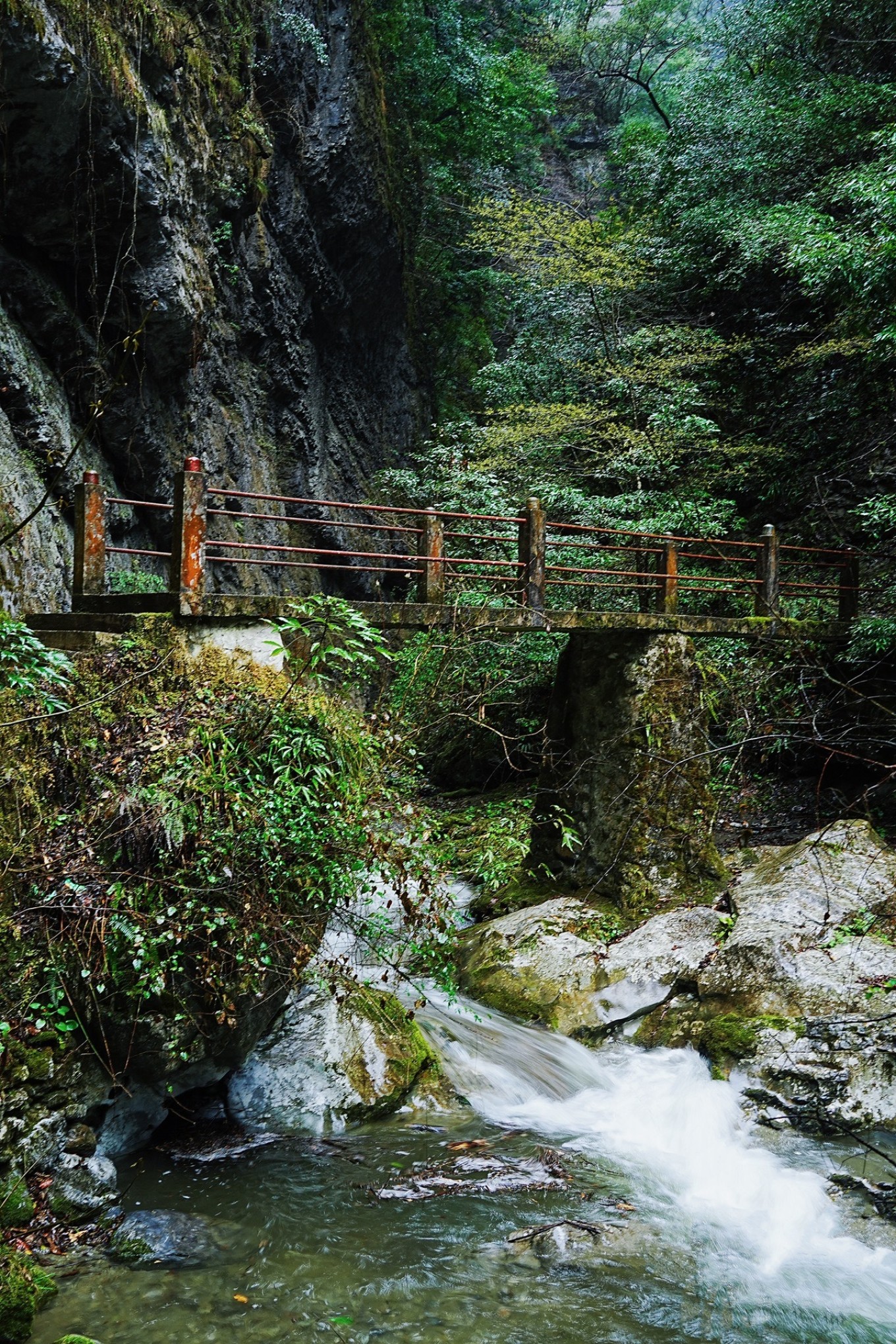 与半成半就得溶洞相比,一线天的喀斯特样貌截然不同,经受时光洗礼的山谷间沟壑分明。身后的景色半遮半掩,整个峡谷沿着野生的溪流生出枝叶乱蹦的杂木,其间偶有小桥流水的雅致景观。青色的苔藓爬满了桥墩和护栏,构造出一派隔世的清闲。