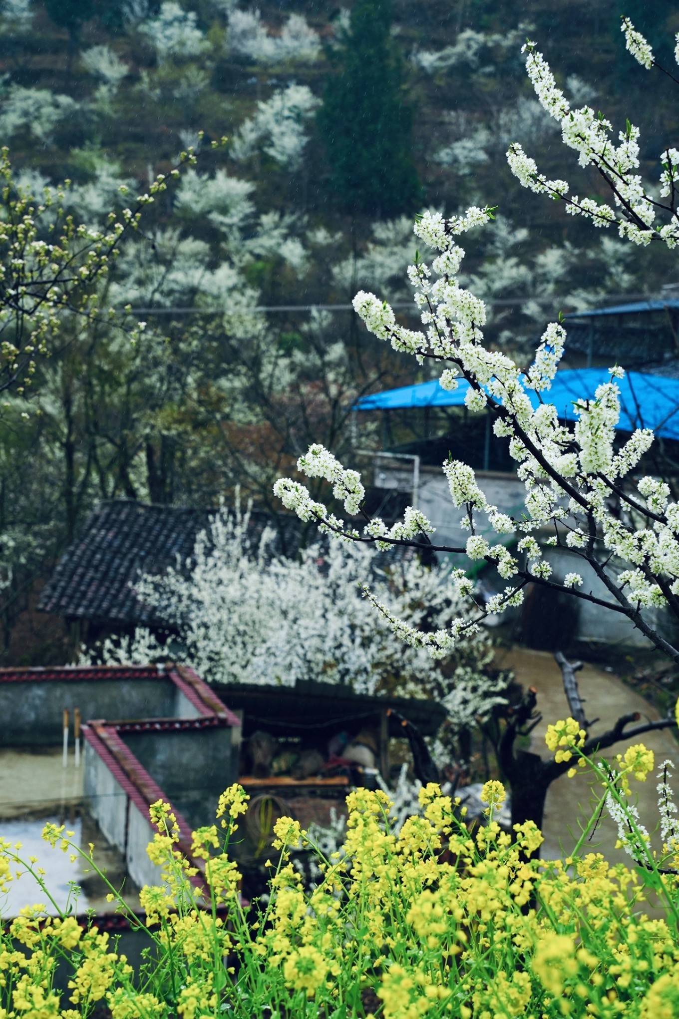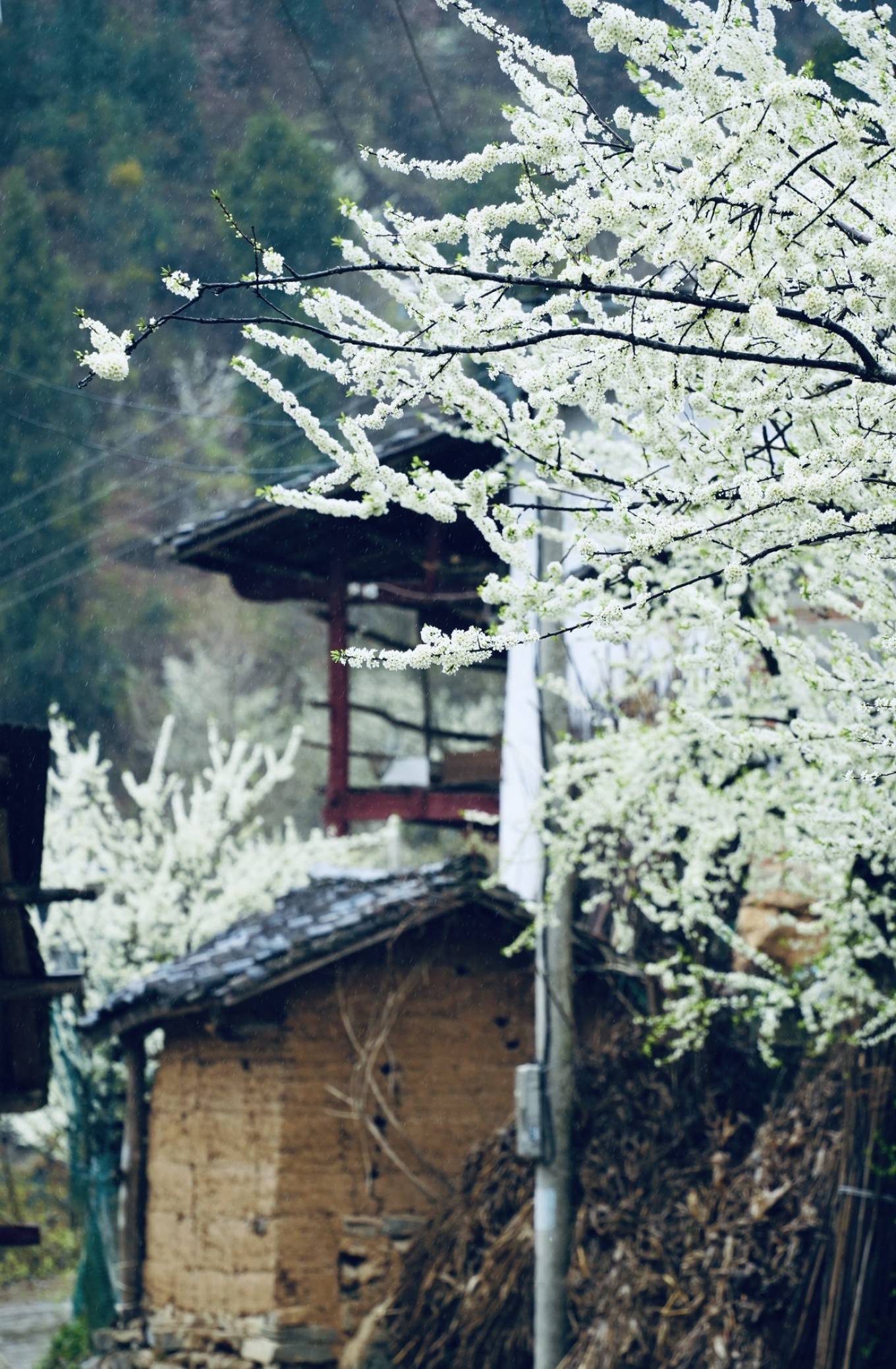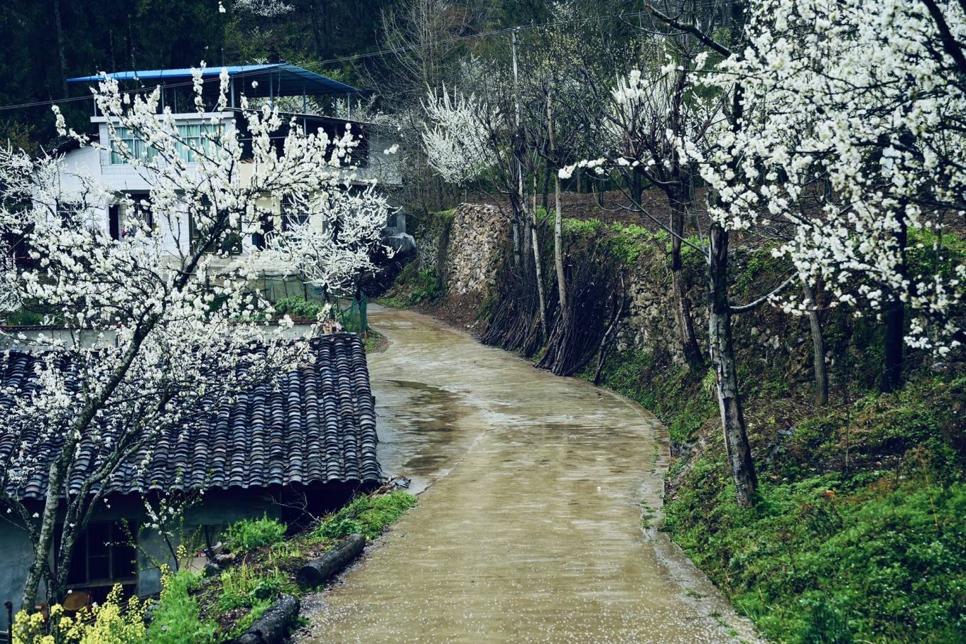 花瓣落下枝头的雨珠也仿佛带着李花的香味,在乡间的石板路上滚动。我们就这样踩着清脆的雨水声在银白的村落行走着,雅趣横生。