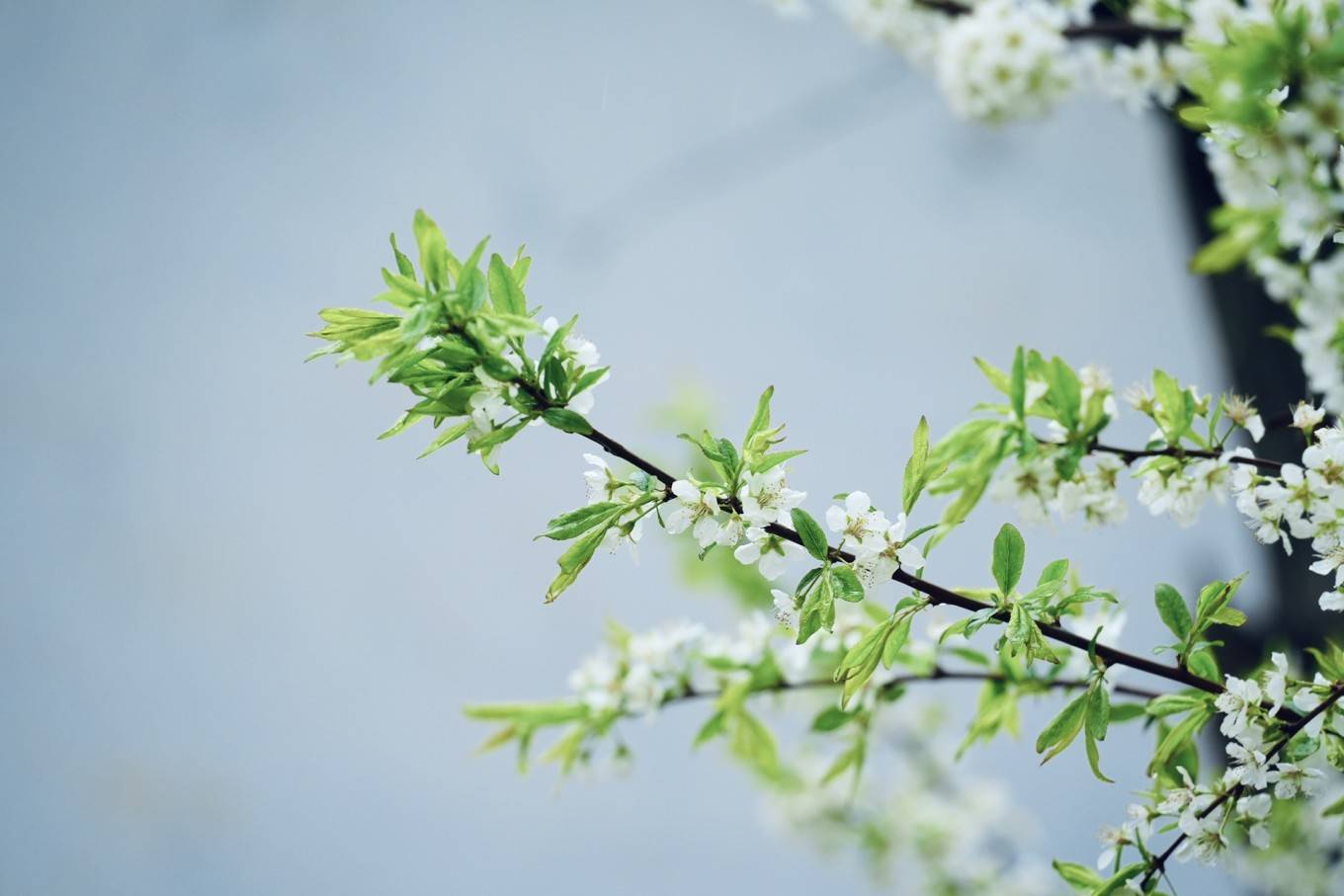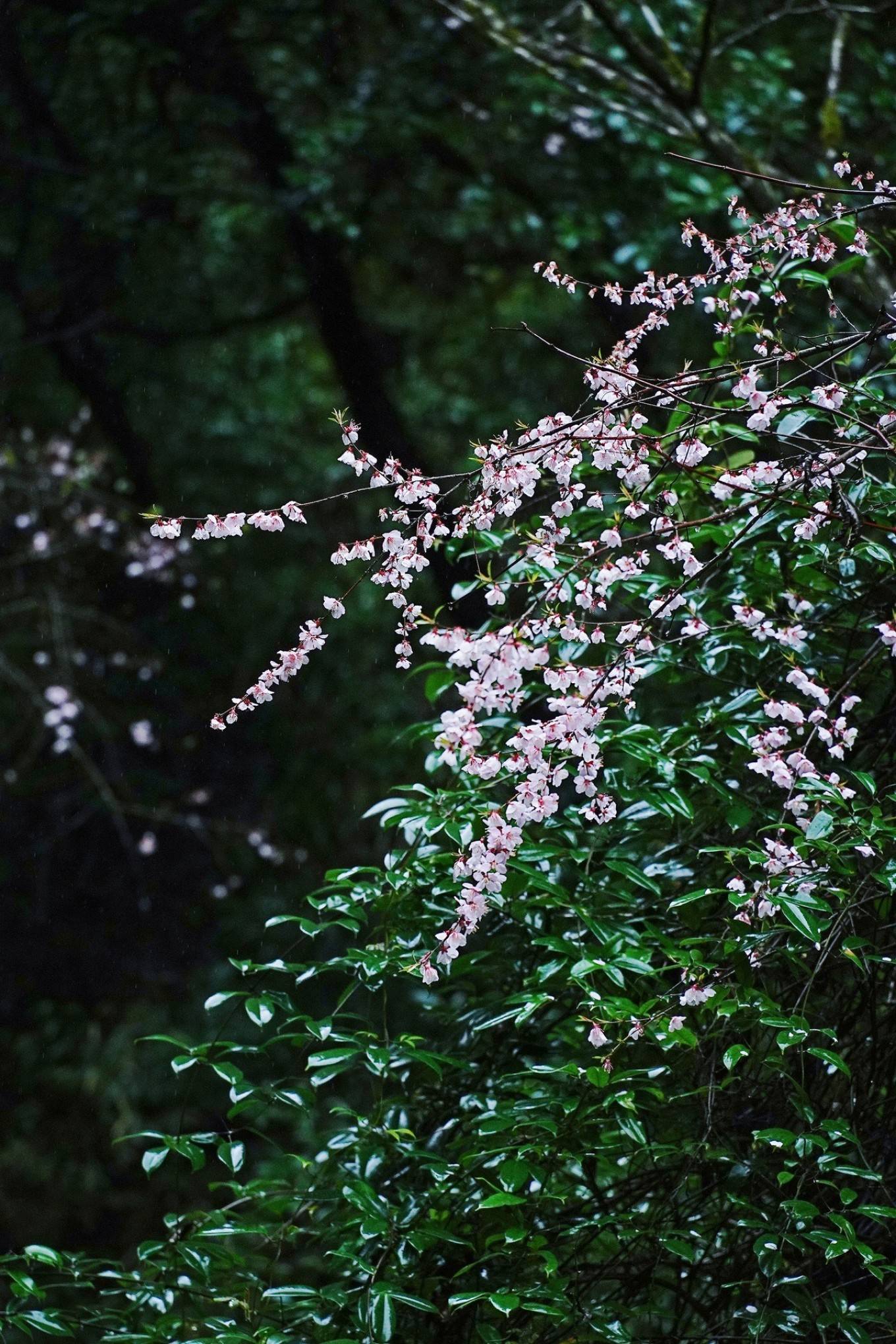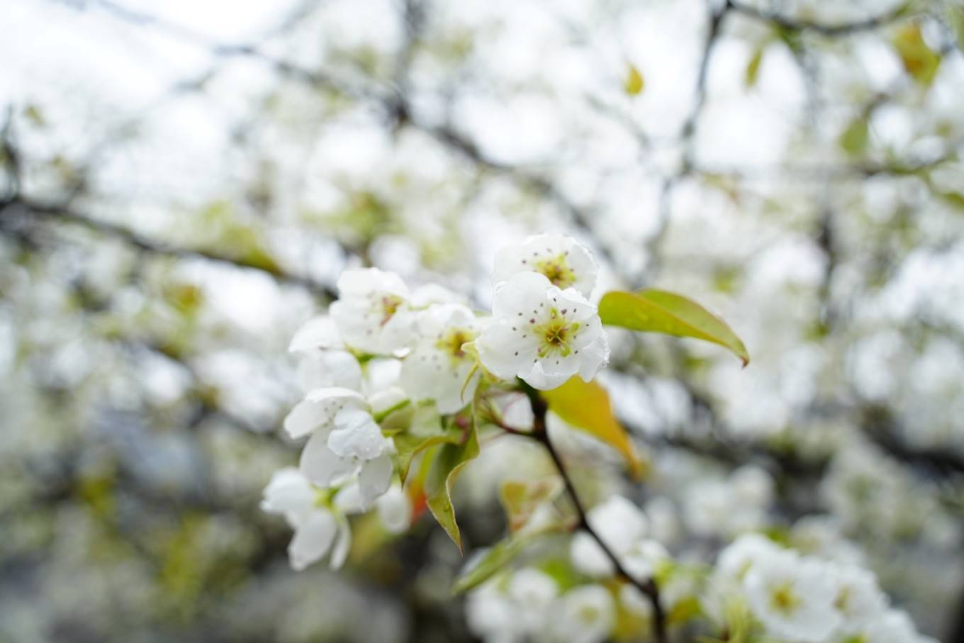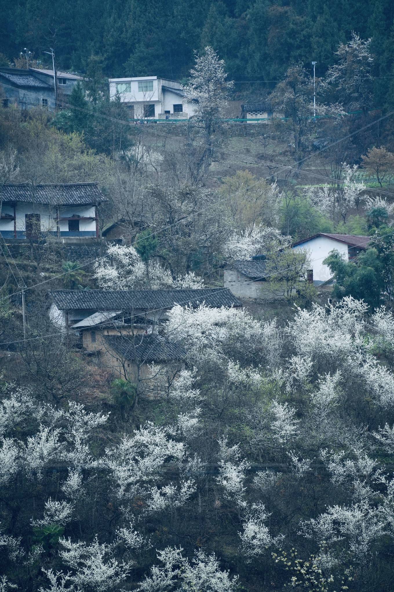 花瓣落下枝头的雨珠也仿佛带着李花的香味,在乡间的石板路上滚动。我们就这样踩着清脆的雨水声在银白的村落行走着,雅趣横生。