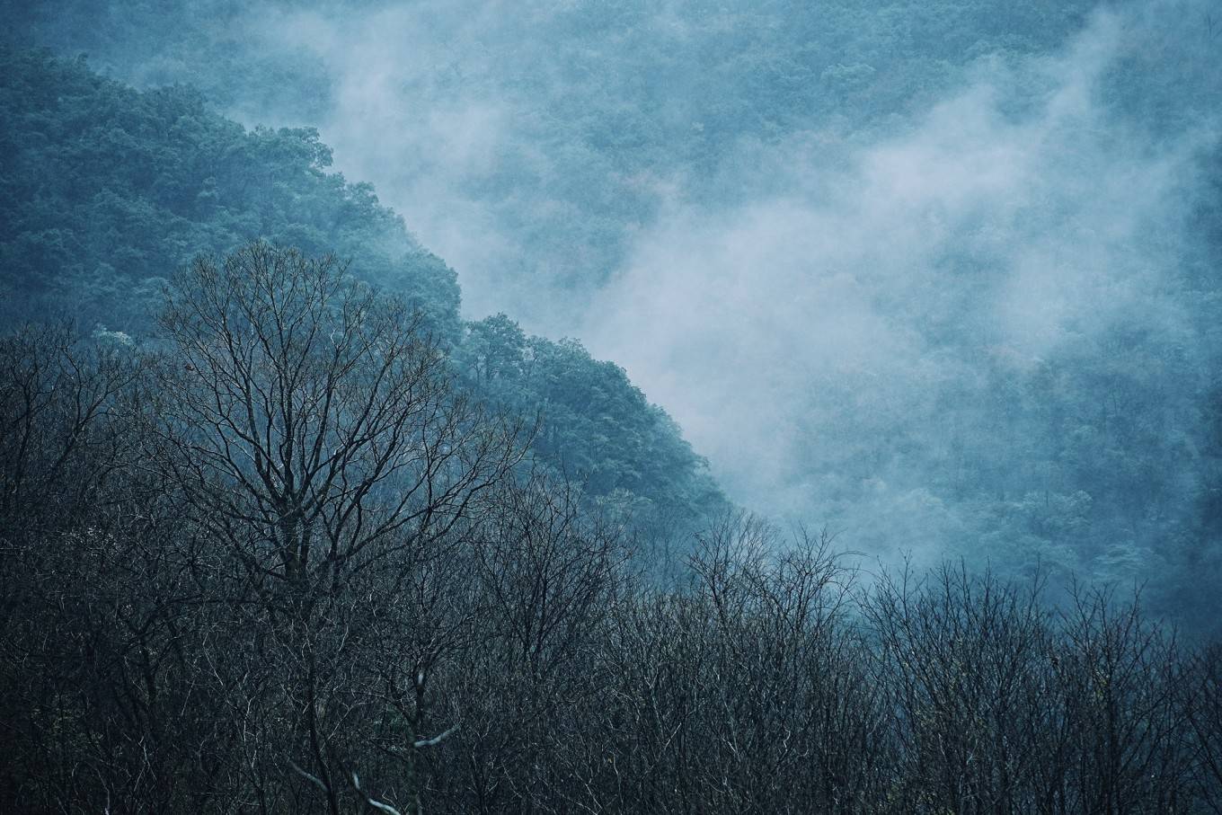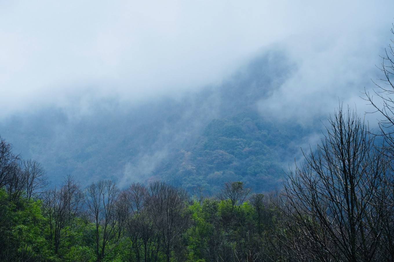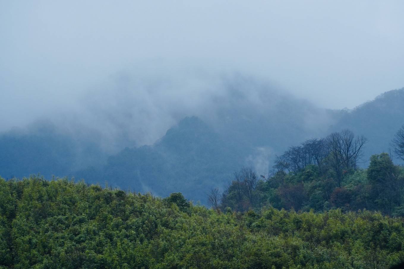 远垂天幕的青山披着薄雾,树木被染上一层墨绿将山连成了沧海。近处的枝丫茂密,吐出清晨的露珠,这个世界仿佛初醒的婴儿,带着倦意慢慢向我们展开怀抱。