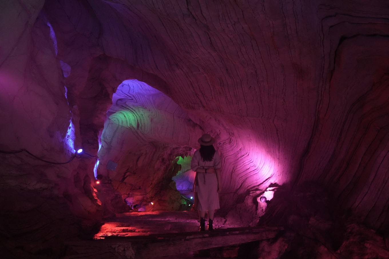石壁上的岩层垒叠有序,好似人为勾勒一般的线条极具视觉冲击力。深入溶洞像是走进了时光隧道,让人迷醉其中,不得其返。