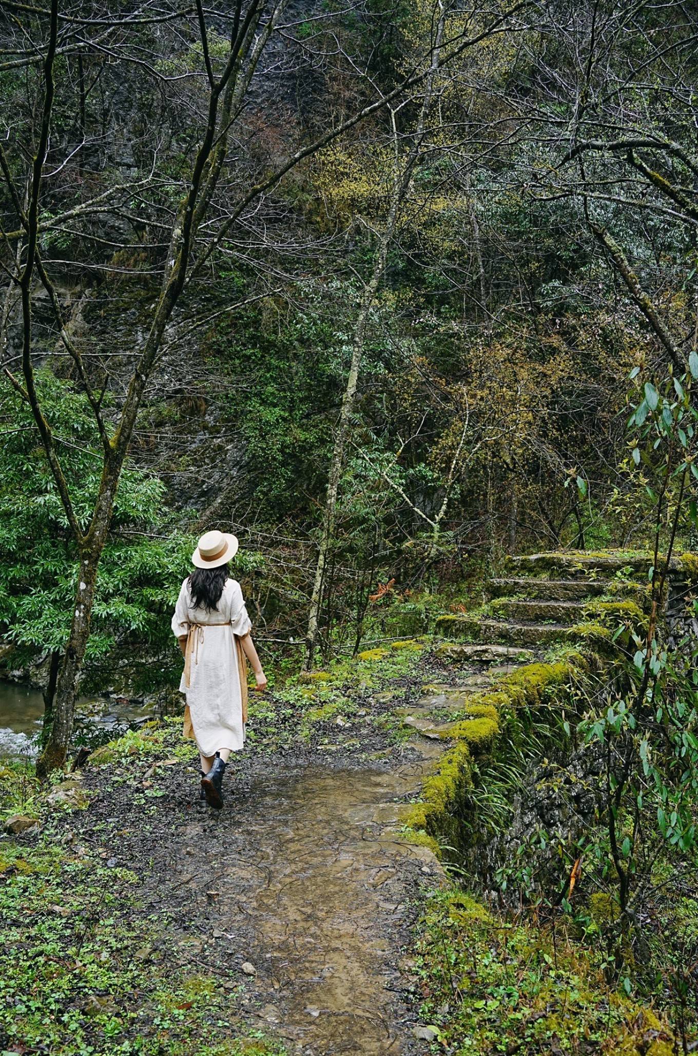 走出溶洞,靠山一处是雷家寨古苗居。沿途栈道穿插在古木丛中,山涧滑破崖间石缝,涓涓细流滋润四周草木,不难得从其中体会到晚春的来意。
