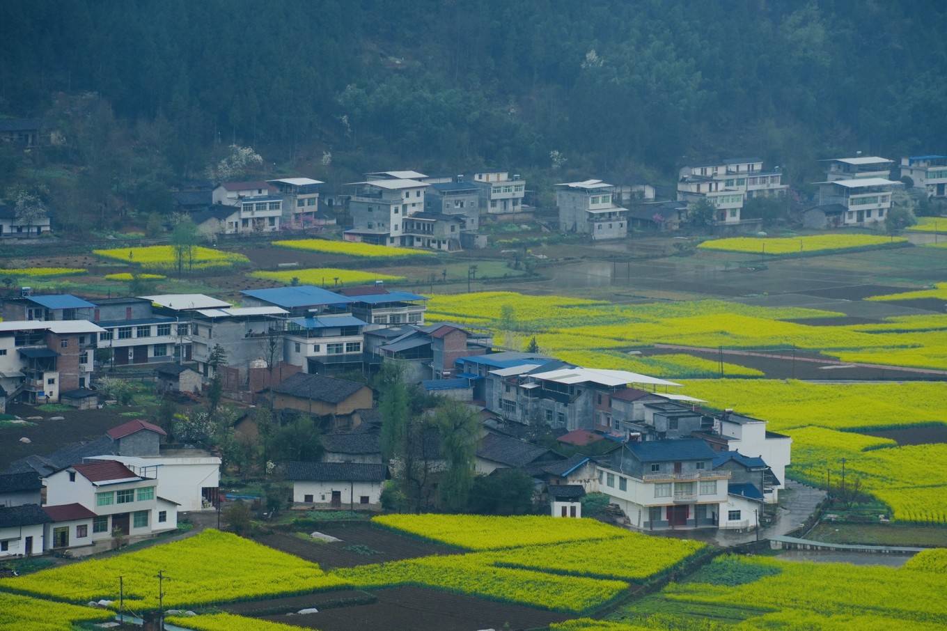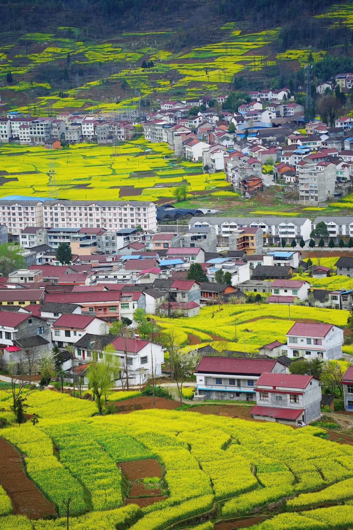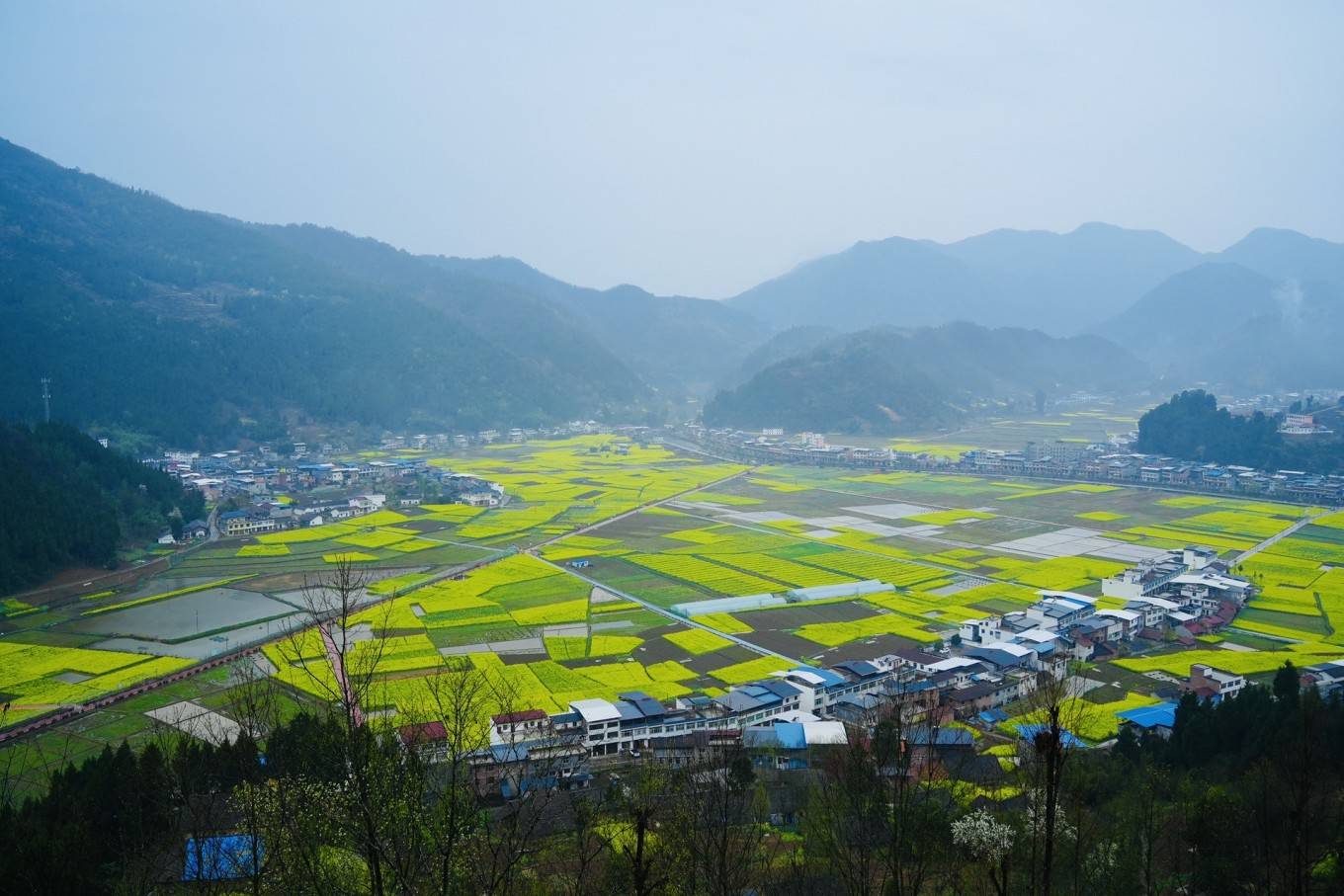 油菜花海从山谷的中心向山谷周围散开。这里的渔渡镇自古就是巴山重镇,站在九家榜村的问侯亭观景台上俯瞰,金黄色油菜花在层层叠叠的巴山梯田间竞相绽放,蜿蜒交错,勾勒出一派影影绰绰的田园风光,令人沉醉。