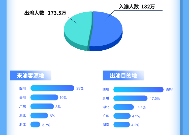 随着成渝地区双城经济圈建设不断深入,成渝两地旅游往来更为密切。五一期间重庆前往四川的游客量达到96万人,同比增长153.5%,前往重庆的四川游客量达到71万人,同比增长132%,重庆大街小巷的每4个游客中就有1人来自四川。洪崖洞、磁器口、朝天门码头、长江索道、十八梯成为来渝四川游客最喜爱的重庆景点,其中,洪崖洞的外地游客中,来自四川占比达到了28.8%。