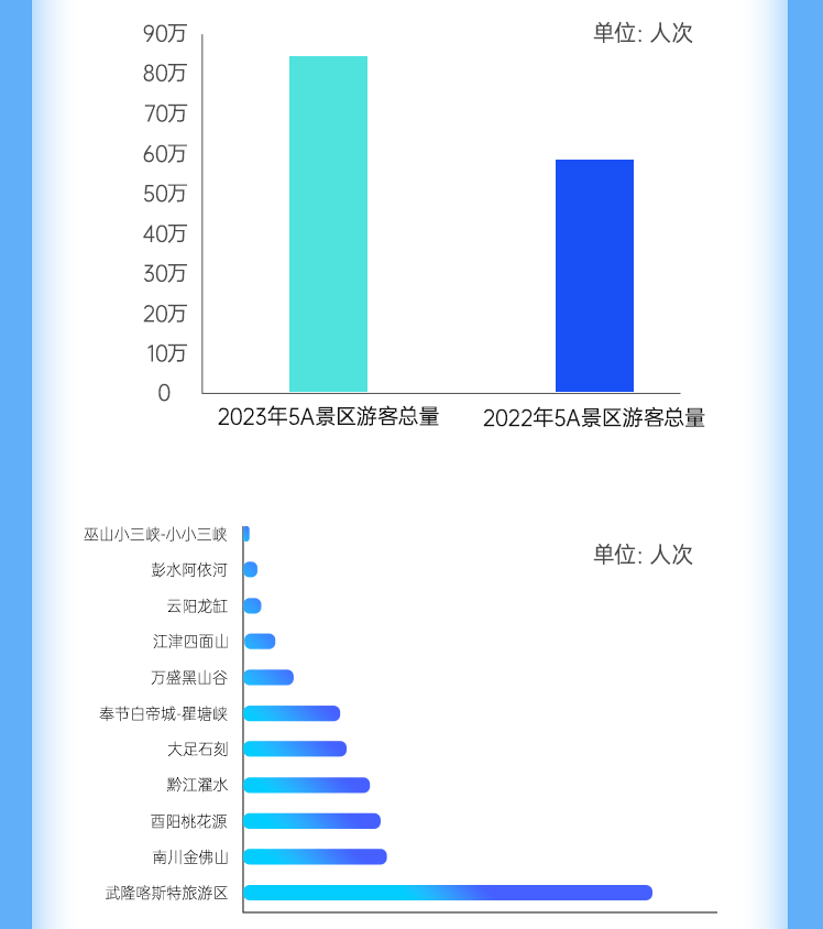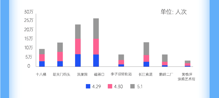 重庆网红景点热度再创新高,据数据显示,五一期间,重庆市5A景区,共接待游客83.9万人次,同比增长37.3%,其中市内游客占比72%。武隆喀斯特旅游区成为其中最热门的5A级打卡地点。磁器口也深受游客欢迎,共接待26万人次,占比23%。洪崖洞、长江索道景点紧随其后,分别以21%,12%占比获得游客青睐。