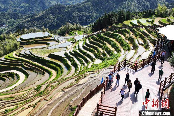 5月1日,江西省遂川县桃源梯田景区田里蓄水丰盈,景色优美,吸引了大批游客前来观光游览。(资料图) 郭弘毅 摄