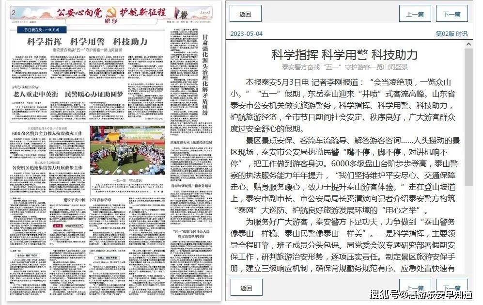▲5月4日,《人民公安报》以《科学指挥 科学用警 科技助力 泰安警方奋战“五一”守护游客一览山河盛景》为题对泰安公安“五一”假期安保工作进行宣传报道。