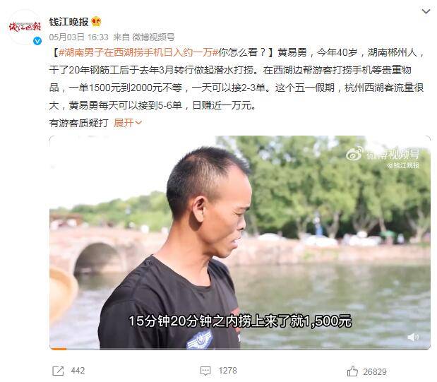 他,40岁,家里有5个孩子。之前干了20年的钢筋工,最近1年在热门景区杭州西湖捞手机,每1部1500元-2000元不等,最多日入1万,每月平均下来月入3万,每月给家里至少打1万的生活费。