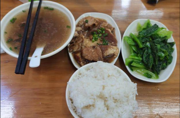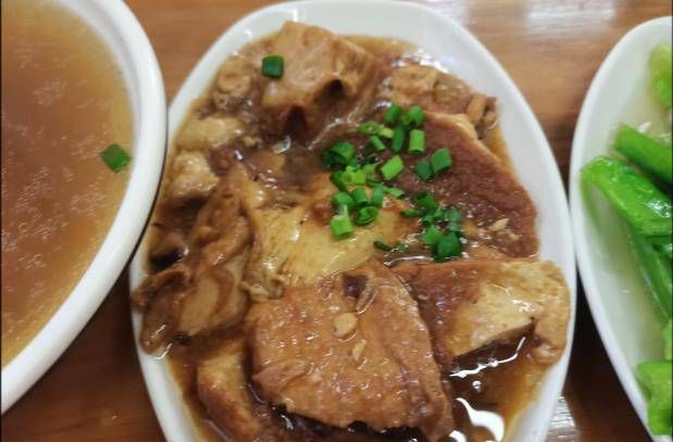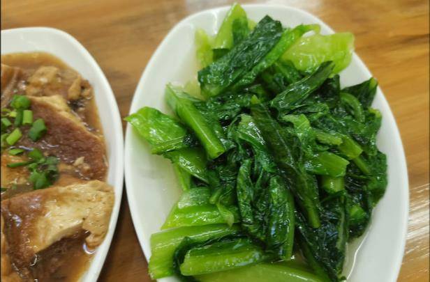 除了牛肉汤,小孟还点了一个客家豆腐一个清炒的莴笋。客家豆腐的做法很简单,一般都是加肉馅儿一起酿制,属于一道荤菜,不过这家店只是简单的烧豆腐,加一点酱油,颜色就深沉起来,勾芡之后更是油润诱人,看着就开胃。配上爽口的蔬菜,这样的两荤一汤搭配得合理,很是下饭,小孟一大早就起来忙到现在,早就饿了,就这汤吃着菜,足足吃了两碗米饭。