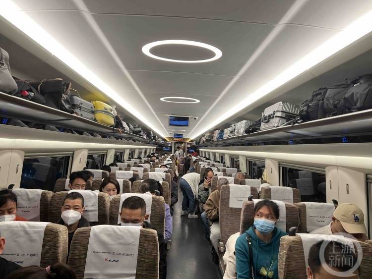 “去香港啦,晚上去看张国荣20周年纪念演唱会。”早上6:55,坐在5号车厢的尹女士非常兴奋,她告诉上游新闻记者,自己一直打算去香港看这场演唱会,得知重庆直达香港高铁4月1日恢复开行,时间也刚刚好,她就一直关注车票信息。