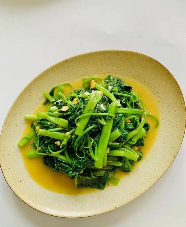 小燕还炒了一个清炒空心菜,分量很少,刚好够一个人吃,将空心菜切成小段,锅中加入一点点油,放入空心菜,炒几分钟,炒至断生变软即可,小燕放了一点豆酱在里面一起炒的,金黄色的豆酱搭配绿油油的空心菜,还挺有食欲的,颜色搭配也很好看,小燕做的每一个菜调料都只放了盐,其他的调料基本没有放。