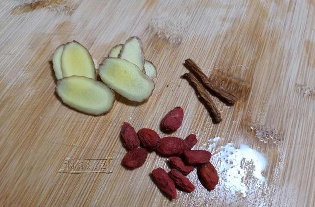 3、接下来准备其他食材,将生姜,枸杞,党参洗净,并把生姜切片,放在案板上备用。