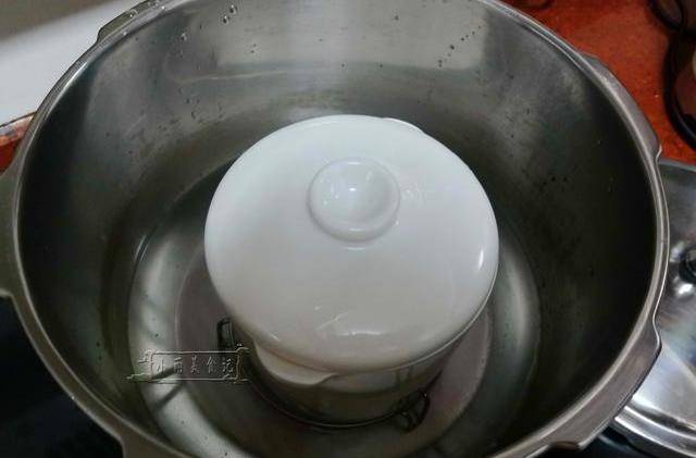 8、盖好盖子。准备一口压力锅,再压力锅锅中放入适量的水之后,把盅放入进去。