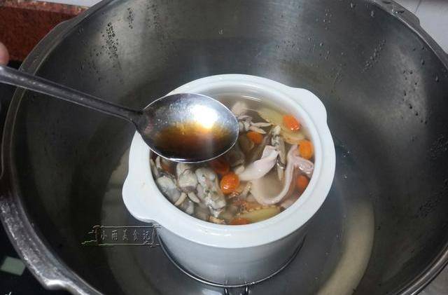 10、直至锅里的食材全部熟透之后,打开锅盖和盅盖,小心烫,再加入一点点料酒就可以啦。