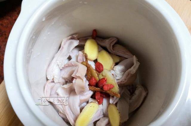 5、取出平常炖汤用的盅,如果没有盅,用高压锅也可以。将猪肚生姜,枸杞,党参放入盅里。